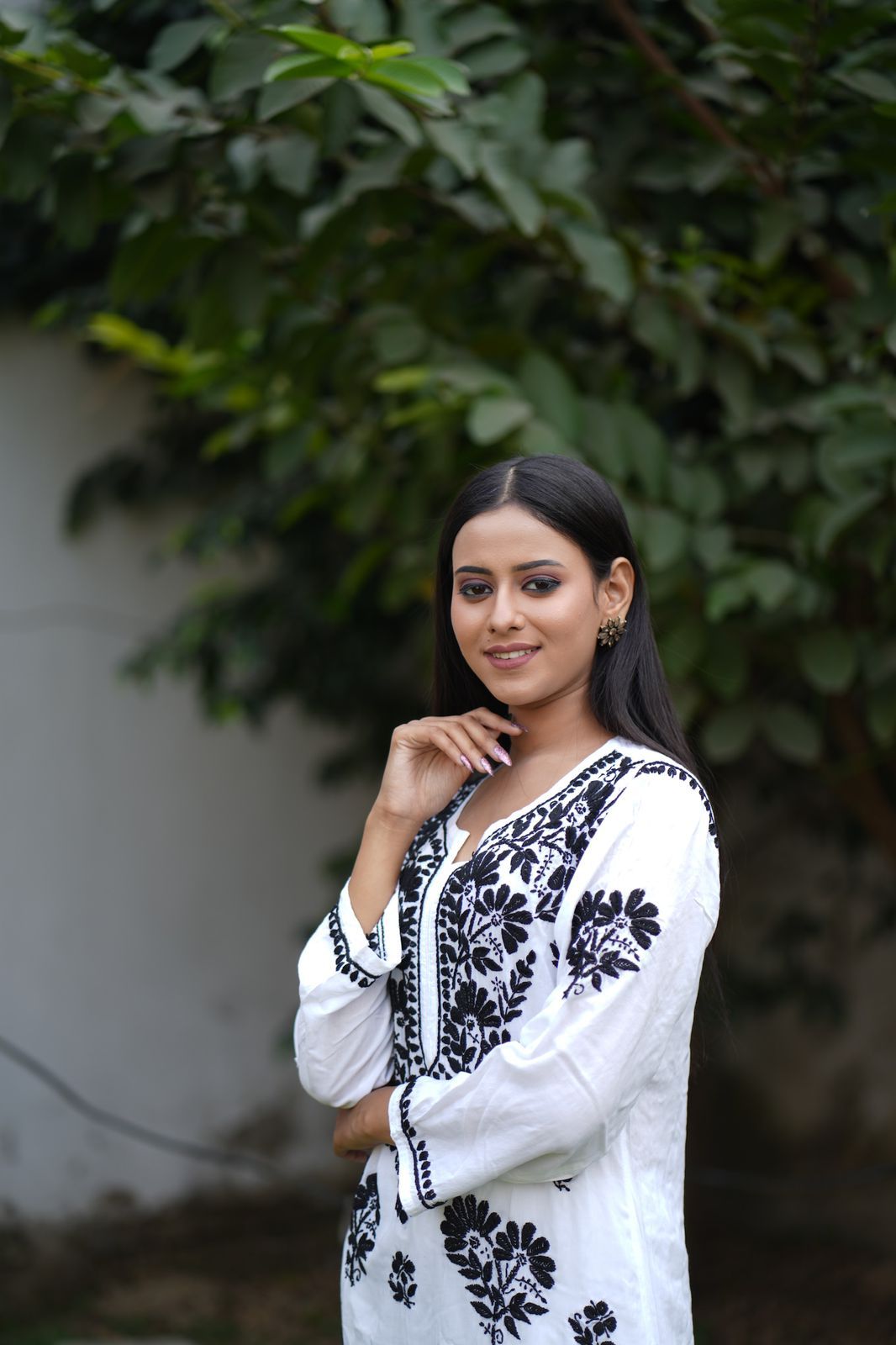 The Modal Chikankari Straight Kurta features elegant black thread embroidery, combining traditional Lucknawi craftsmanship with modern style. The straight cut offers versatility, and the soft modal fabric ensures comfort. This sophisticated piece is ideal for both casual and formal occasions, easily paired with leggings or palazzos for a timeless ethnic look.