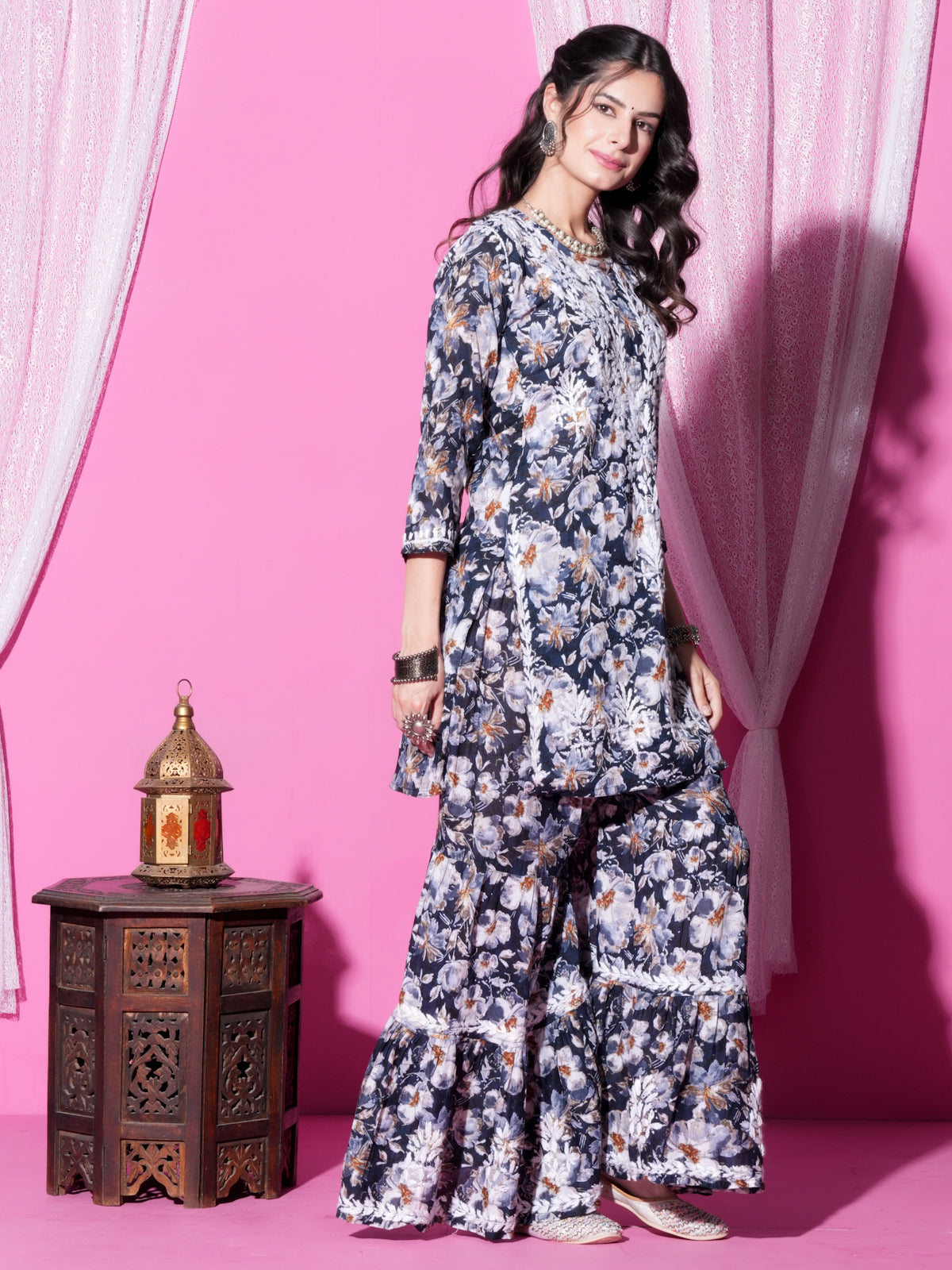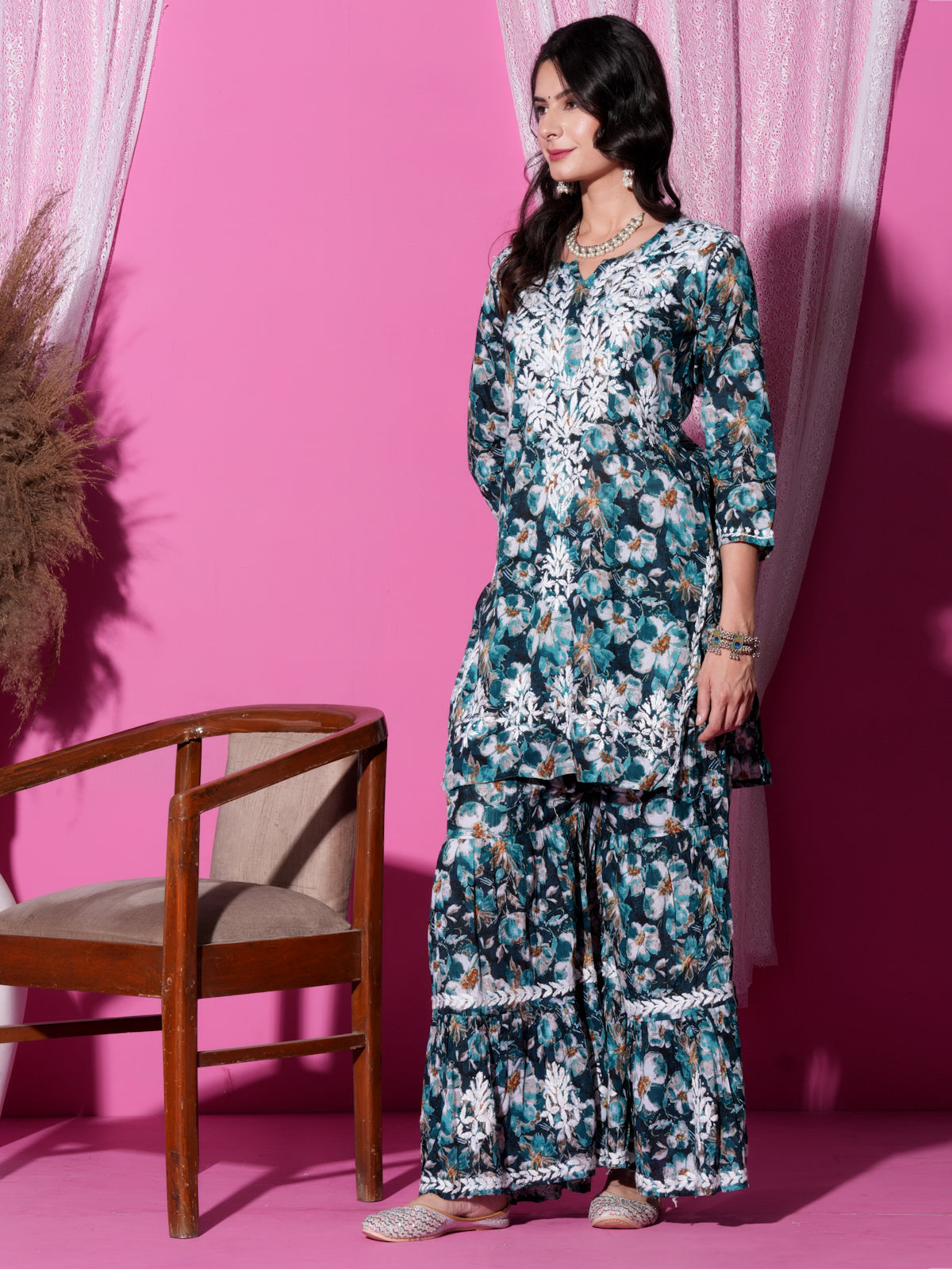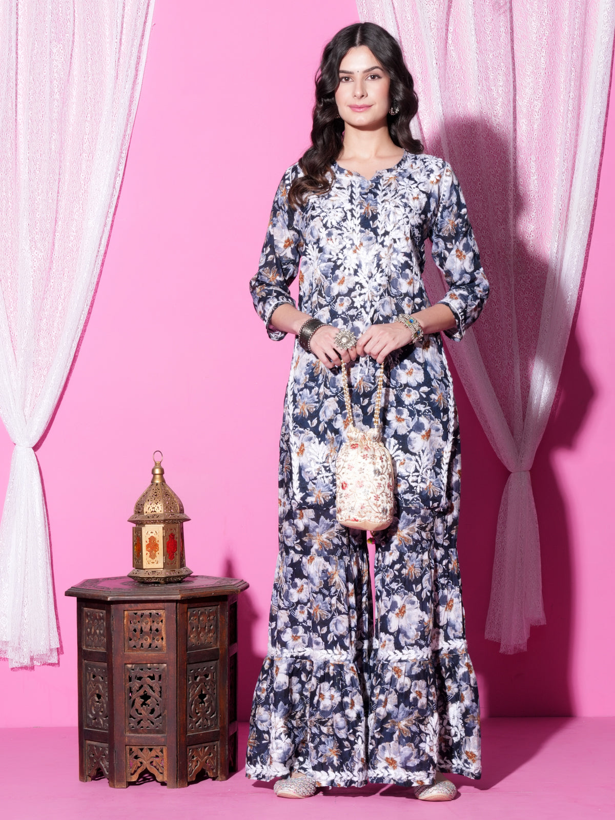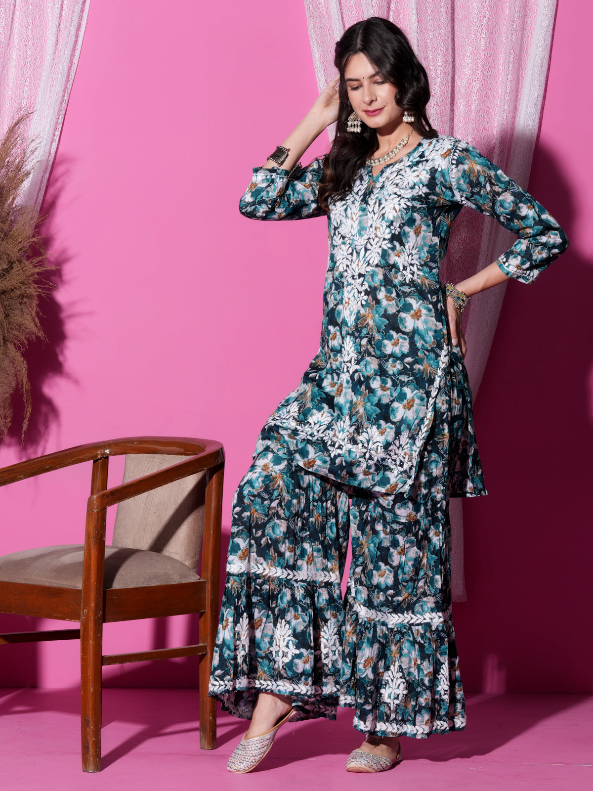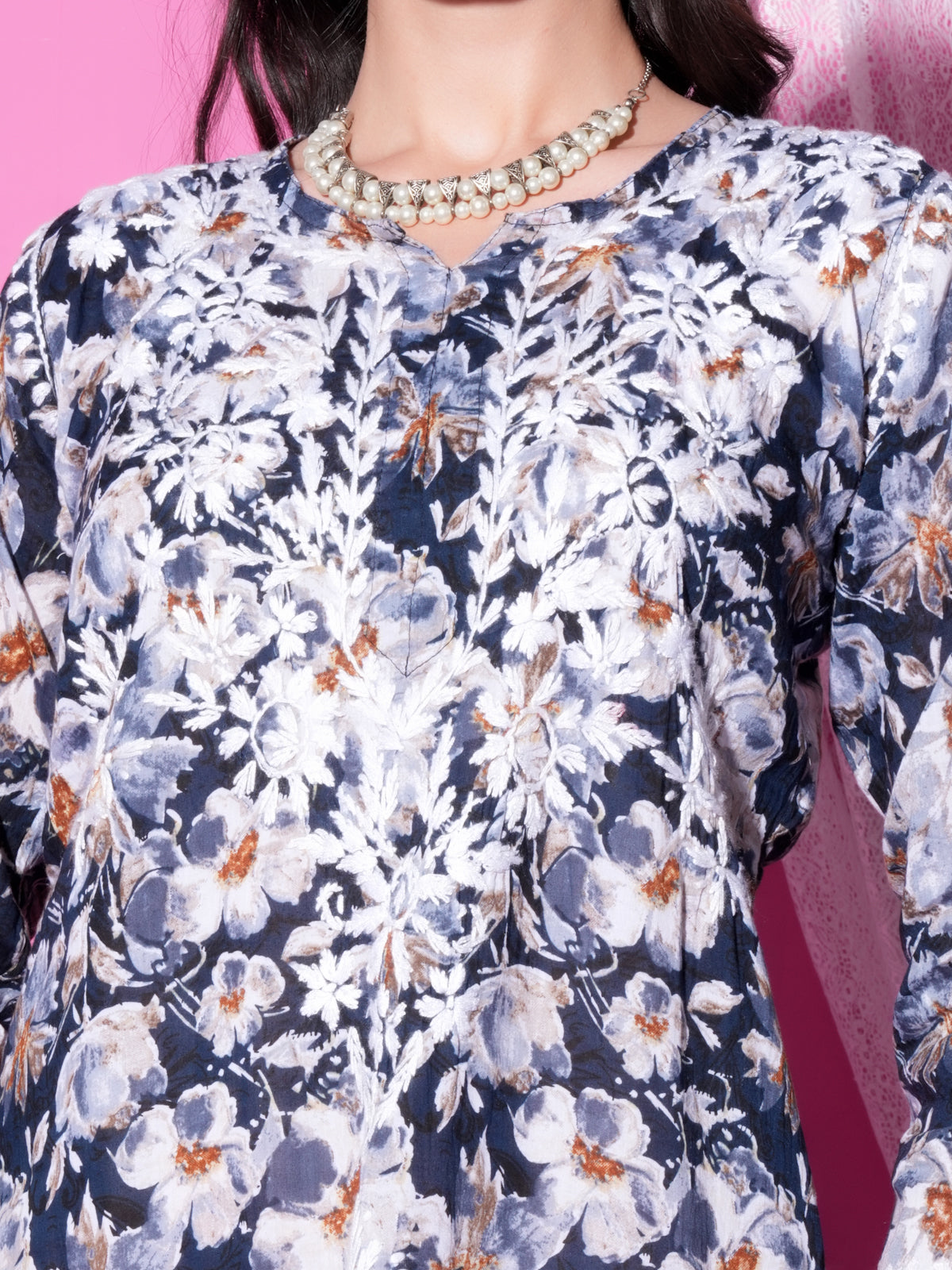 Summer Friendly Mul-Mul Floral Printed Chikankari Handwork Kurta & Stretchable Trouser