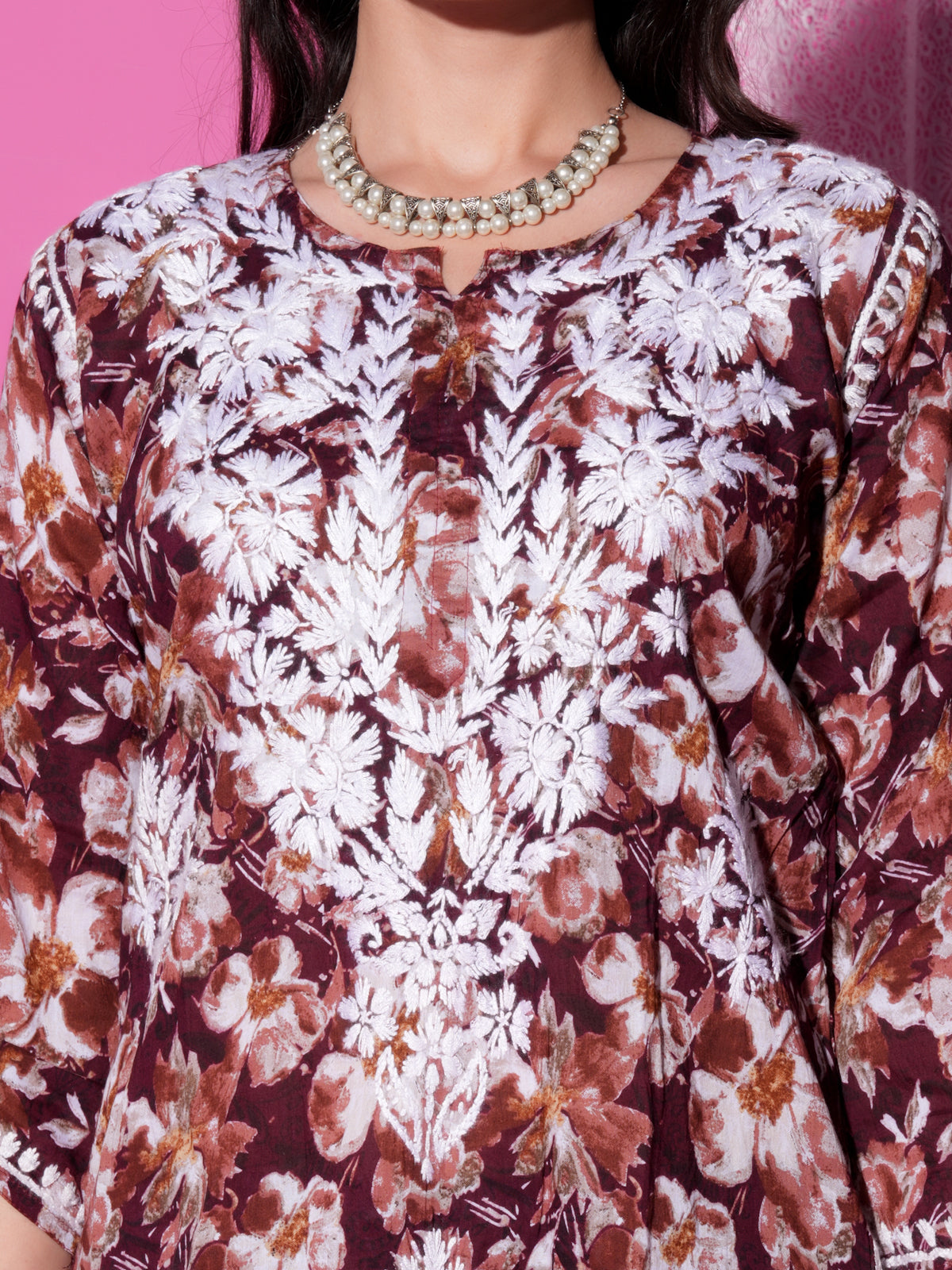 Soft Mul Mul Floral Printed Lucknowi Handwork Chikankari Straight Kurta