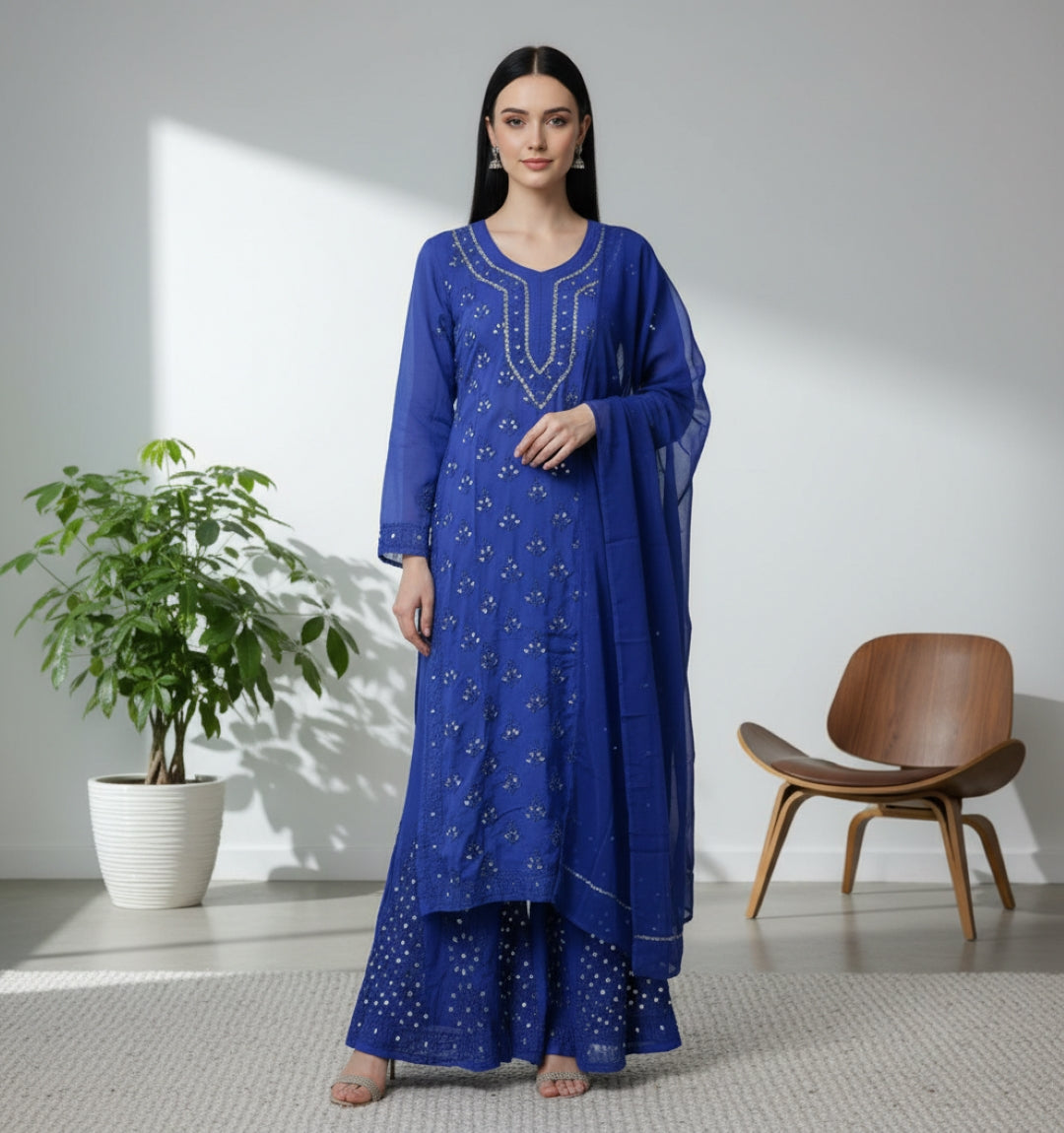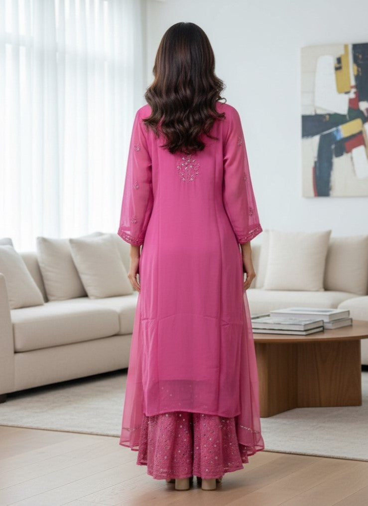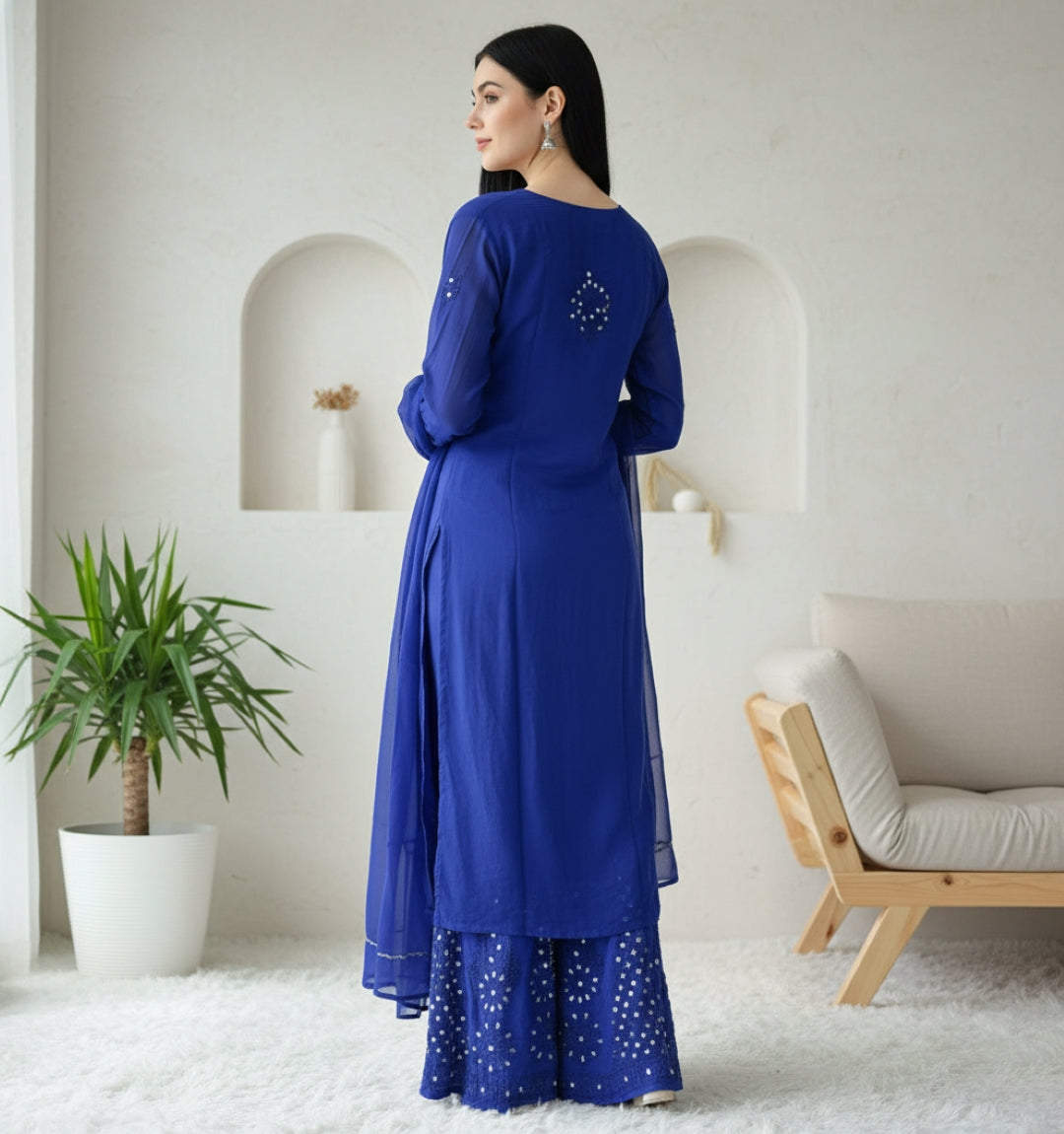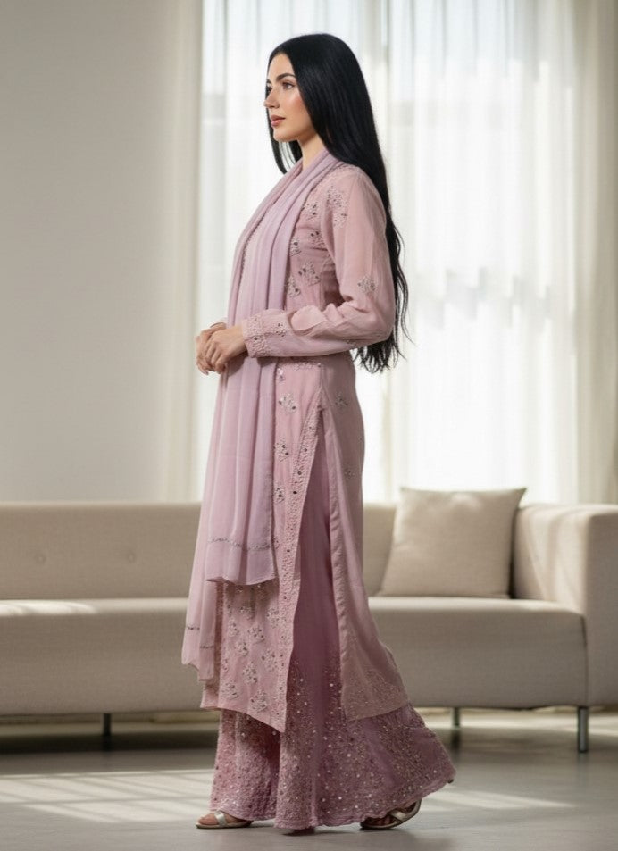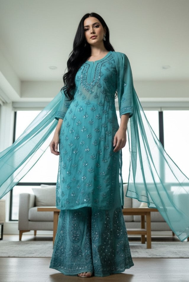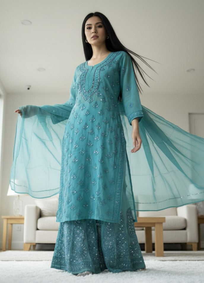 Noor-e-Chikankari Georgette Mirror Kurta Sharara set with Dupatta and Inner.