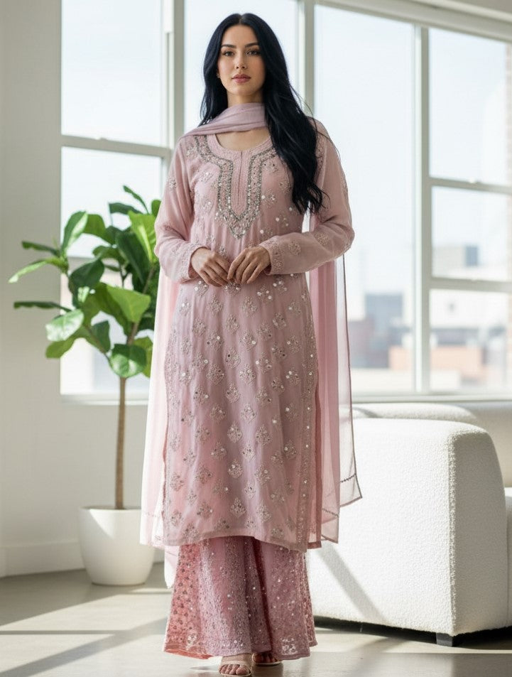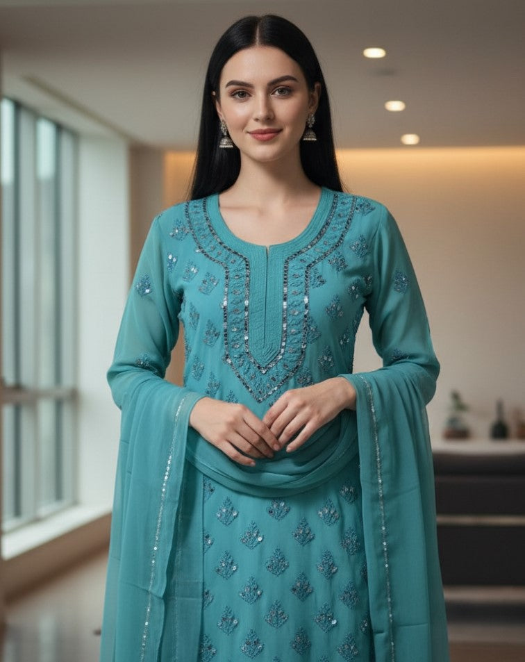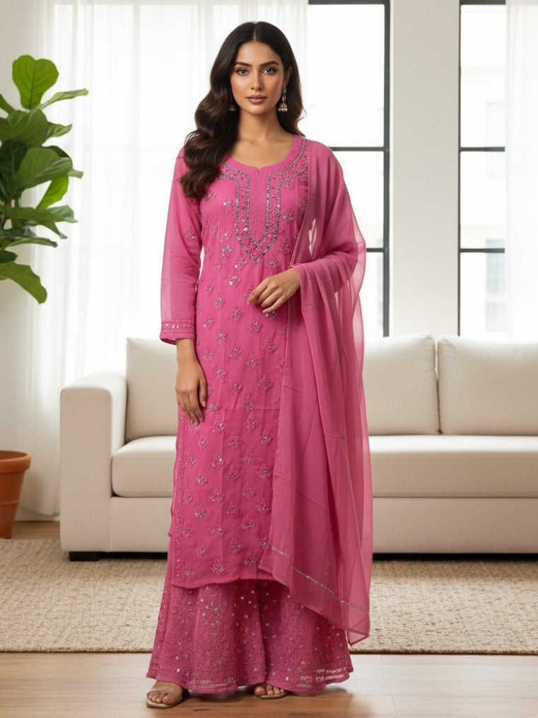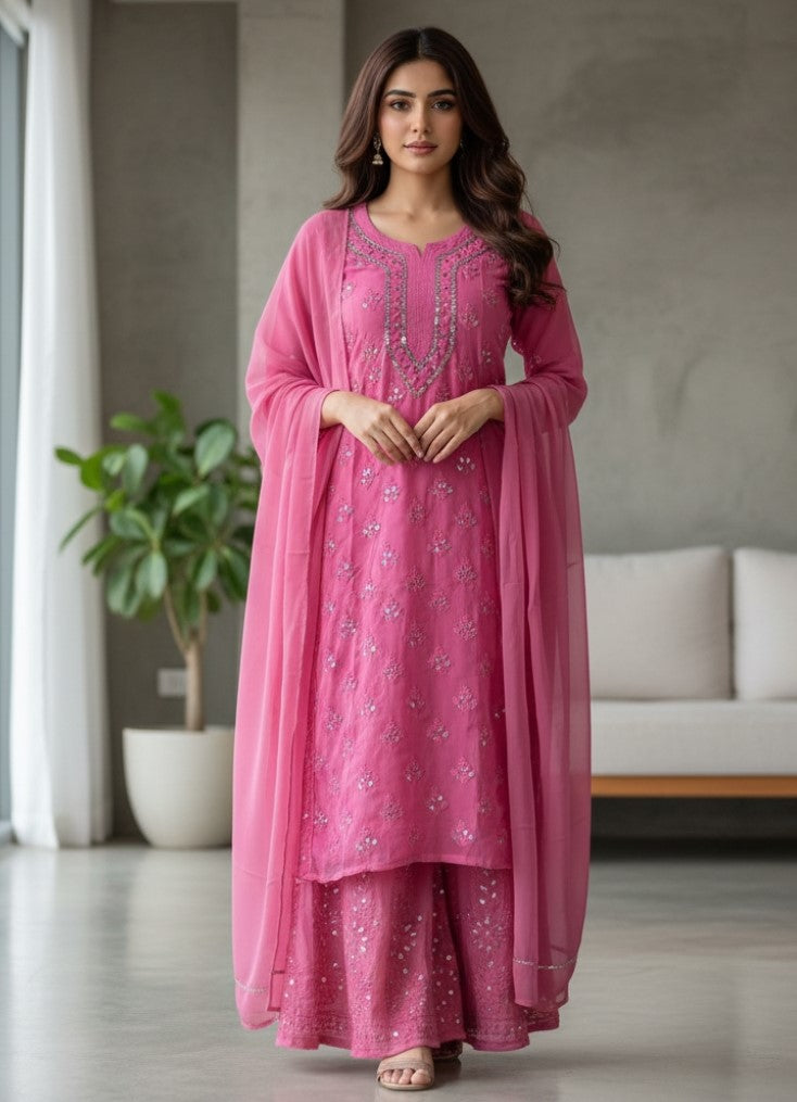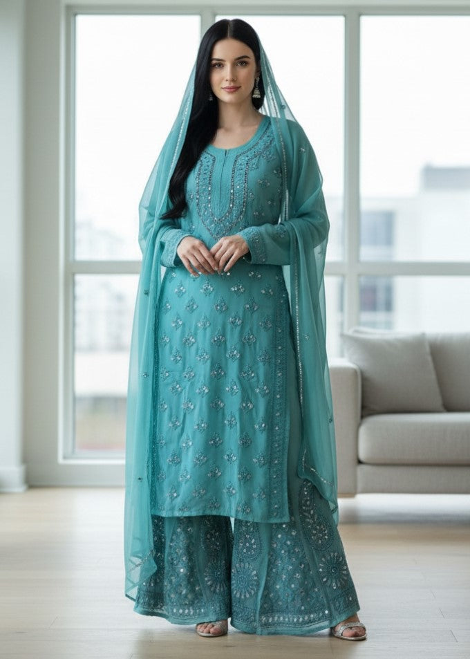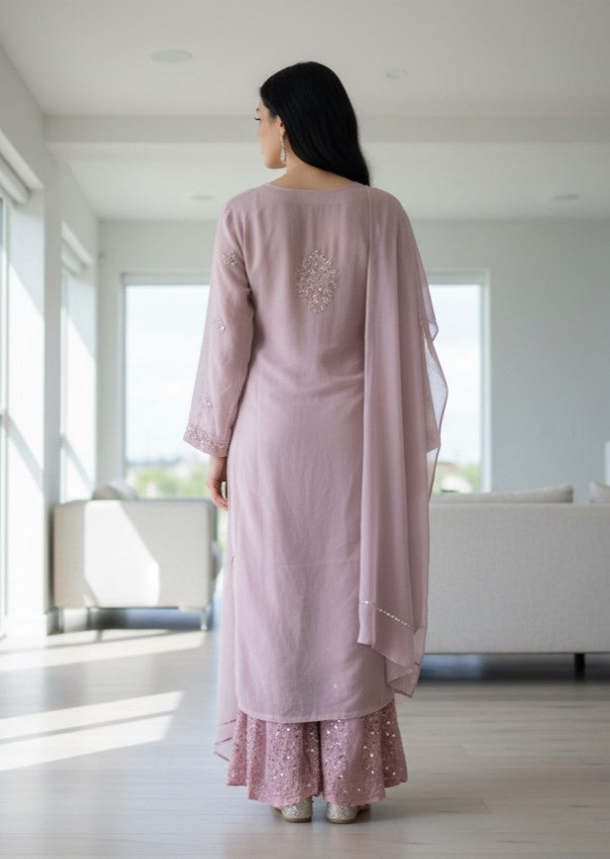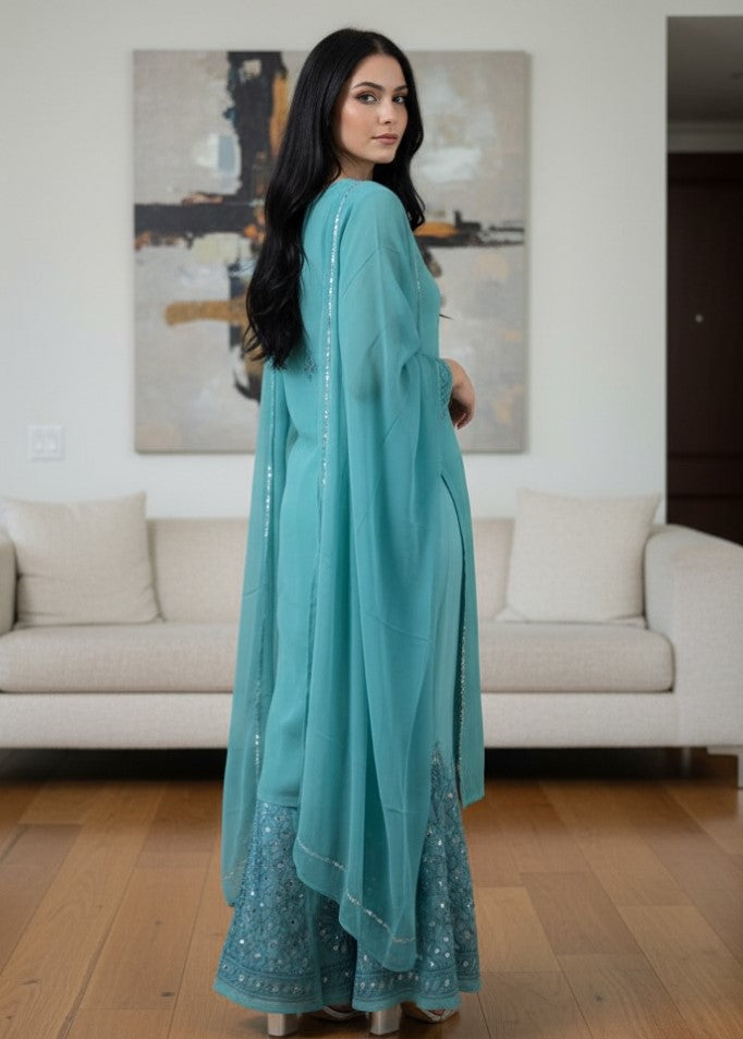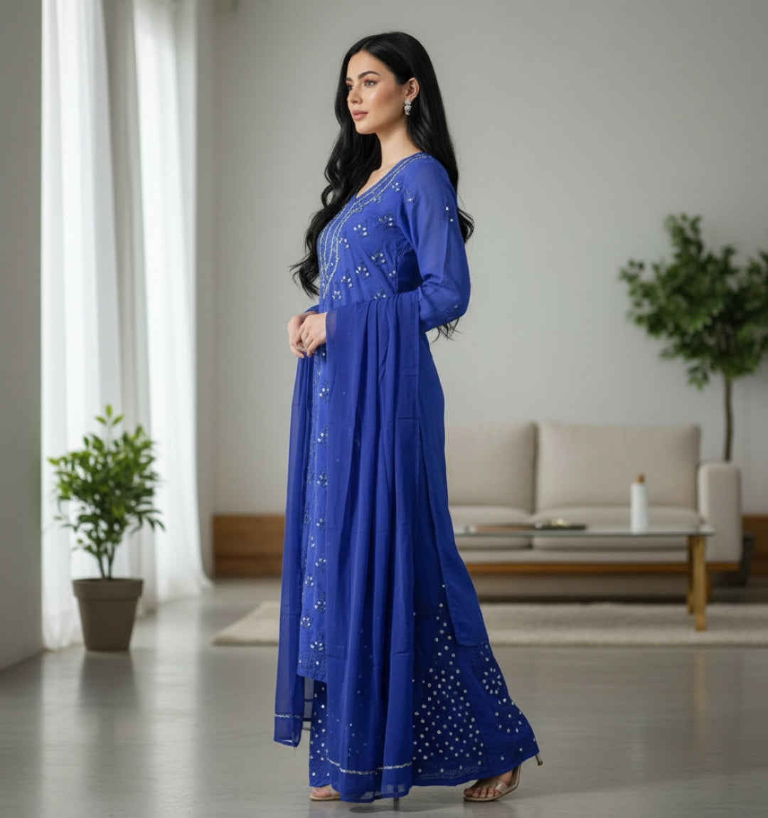 Noor-e-Chikankari Georgette Mirror Kurta Sharara set with Dupatta and Inner.