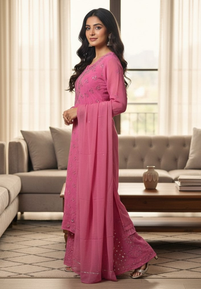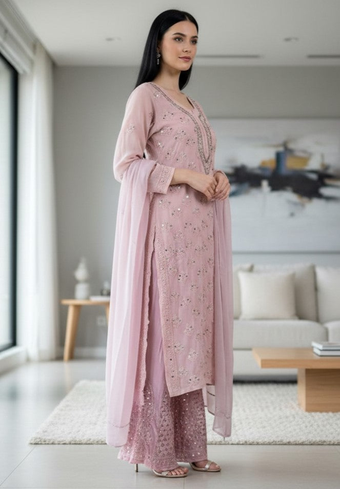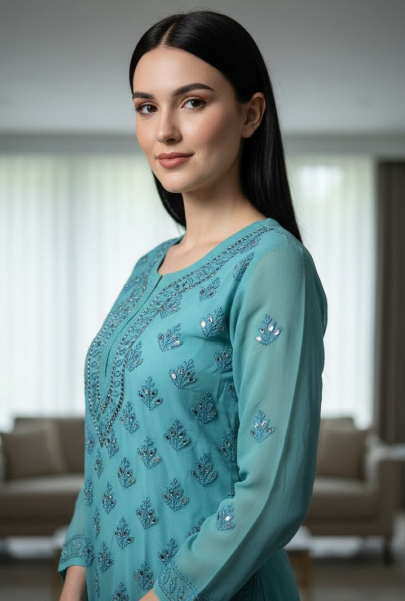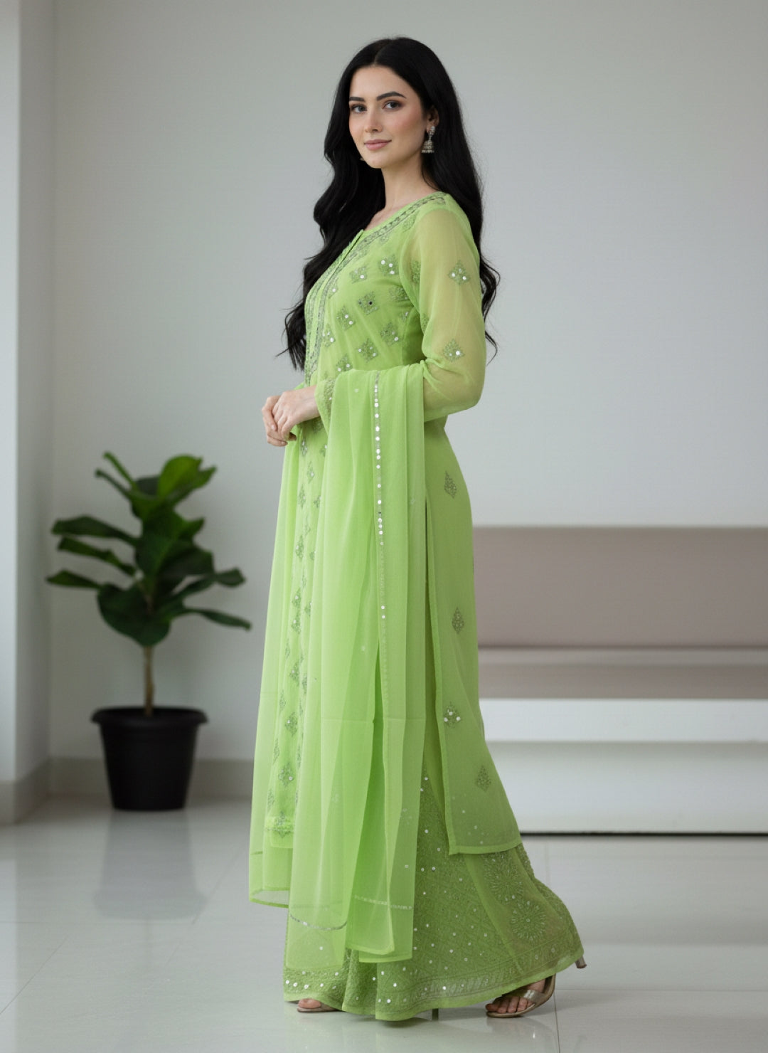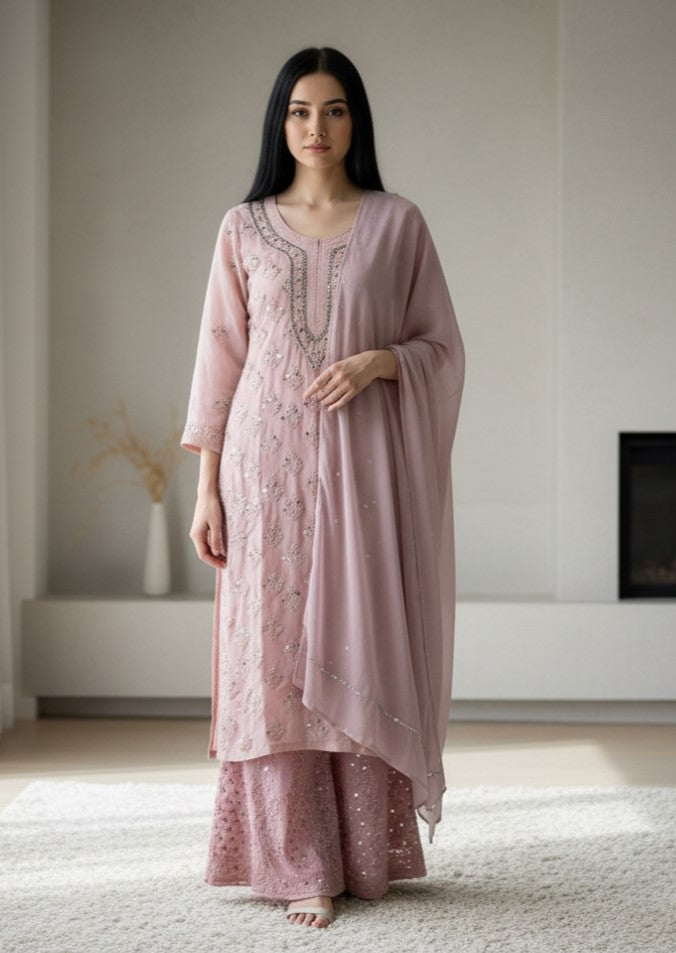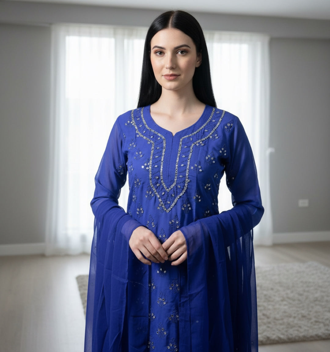Noor-e-Chikankari Georgette Mirror Kurta Sharara set with Dupatta and Inner.