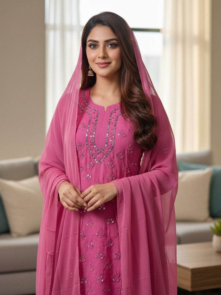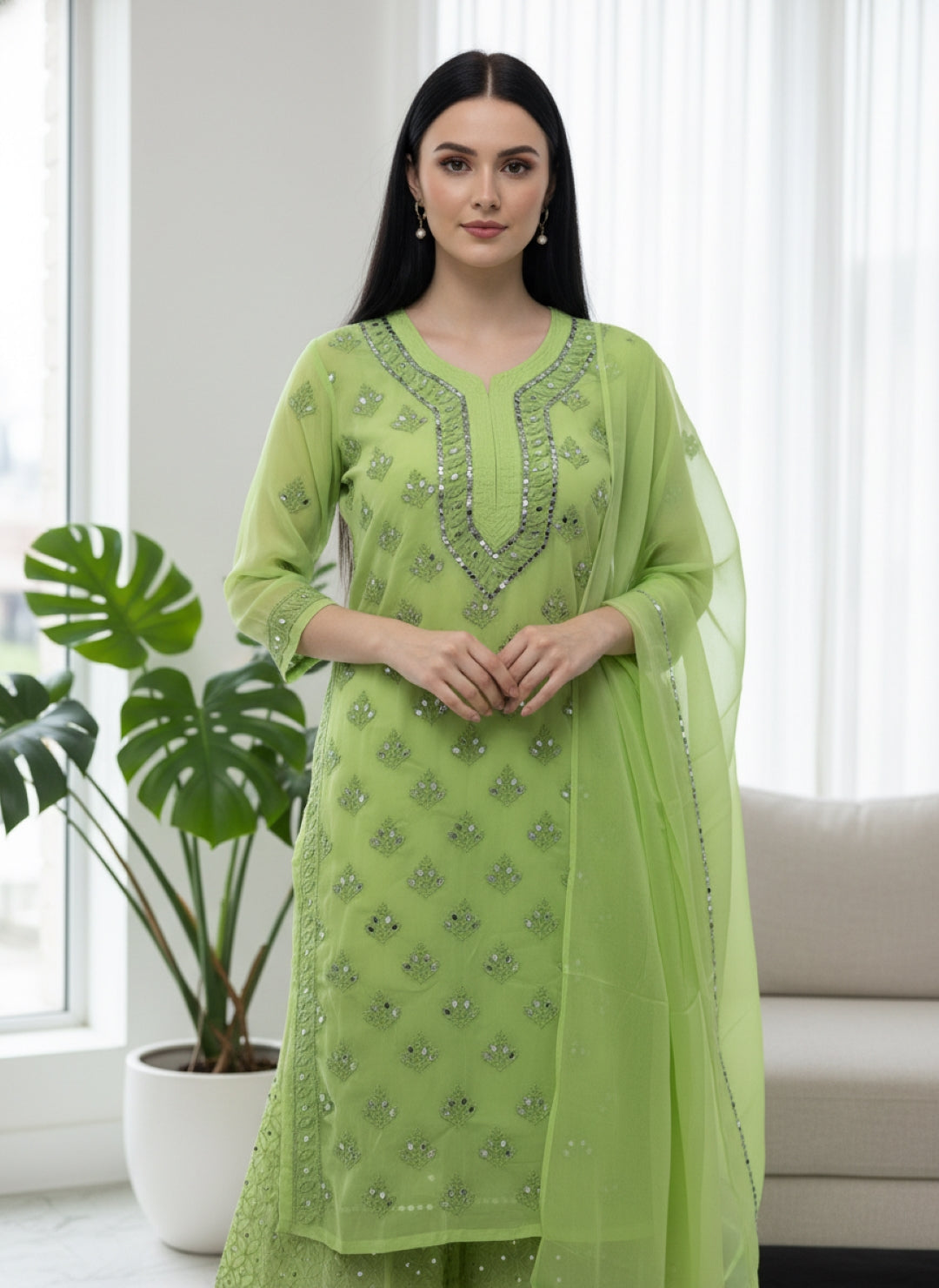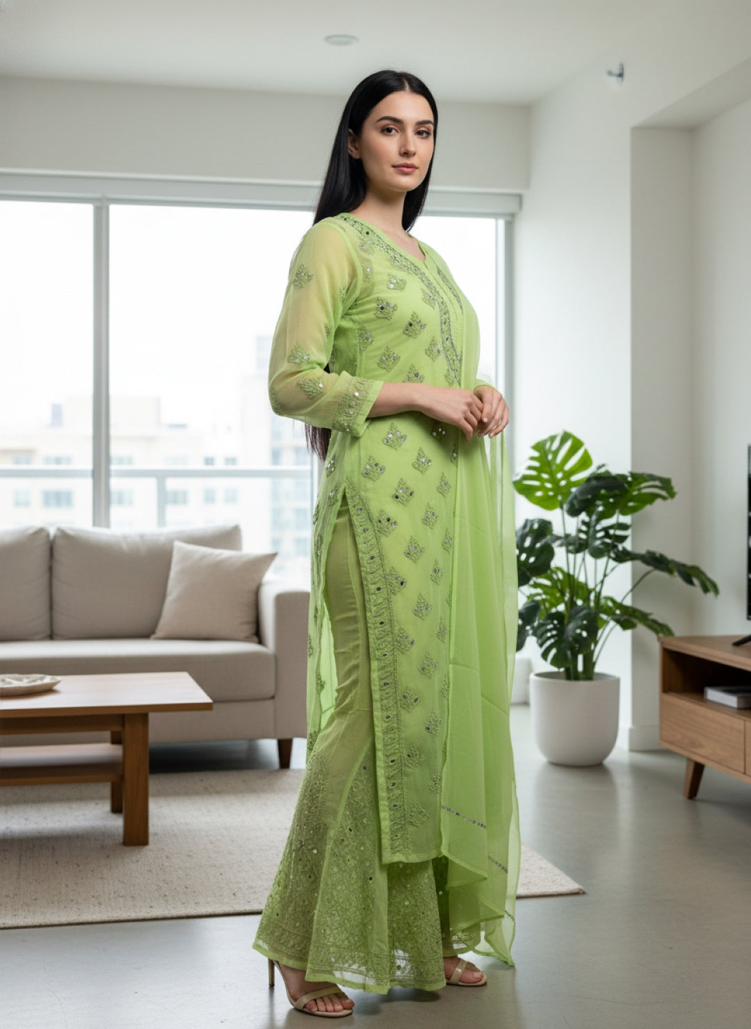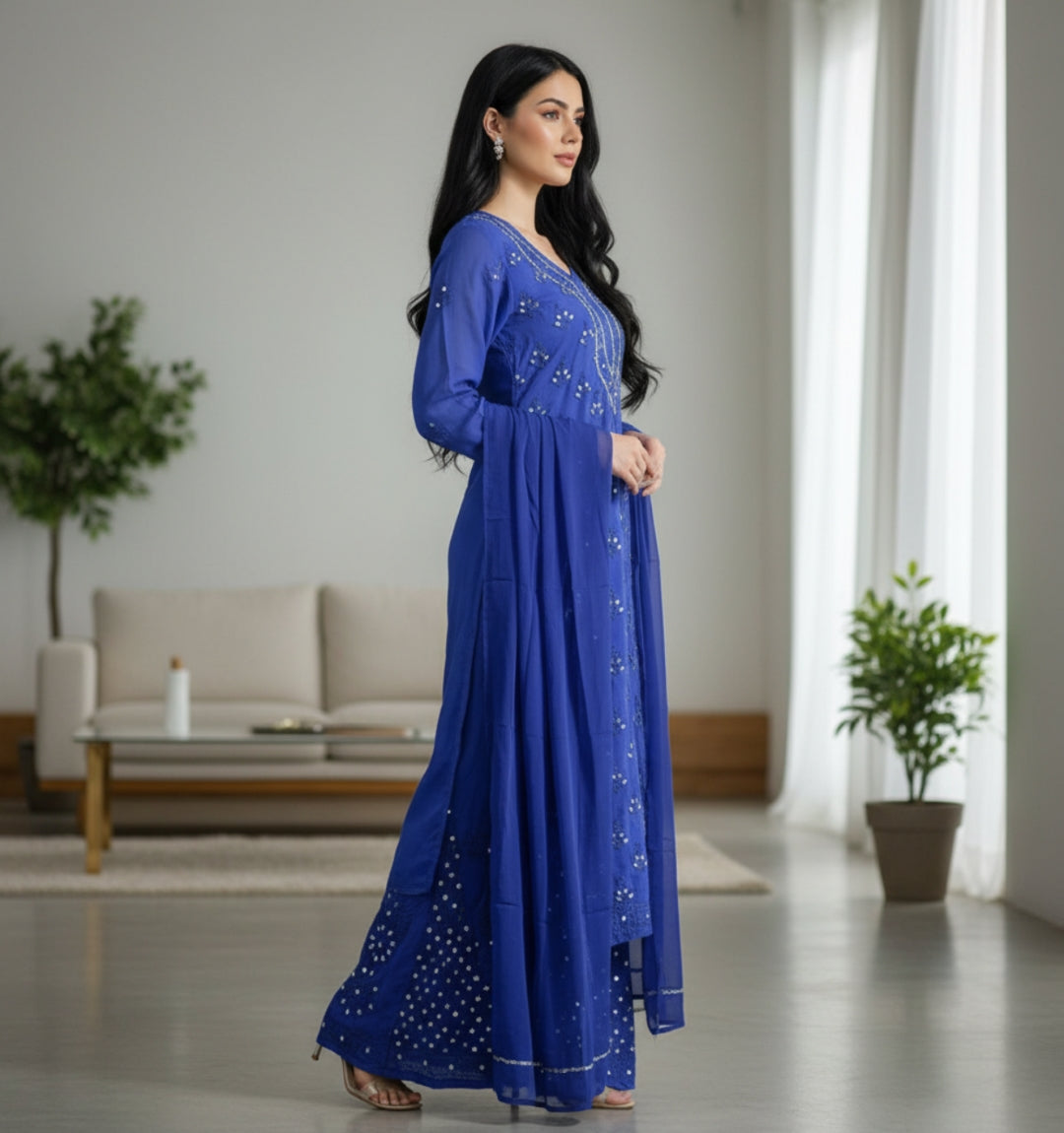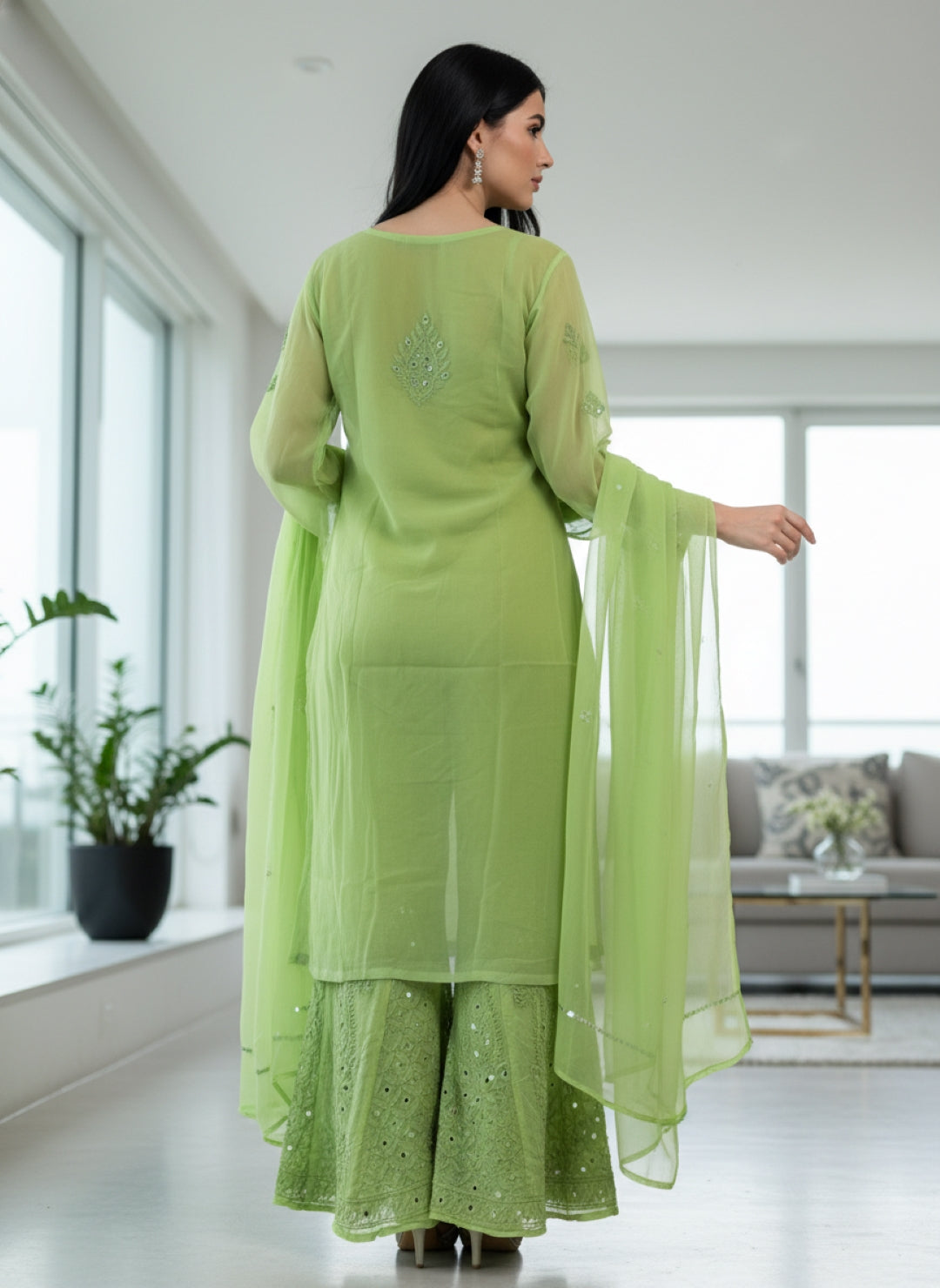 Noor-e-Chikankari Georgette Mirror Kurta Sharara set with Dupatta and Inner.
