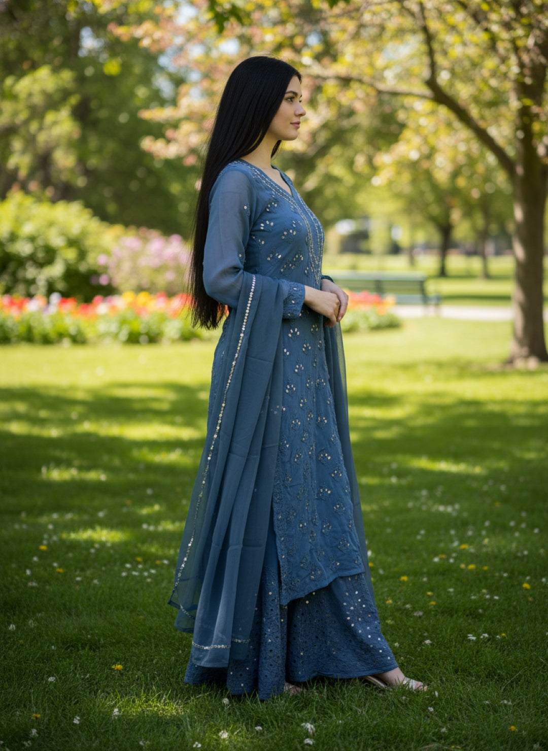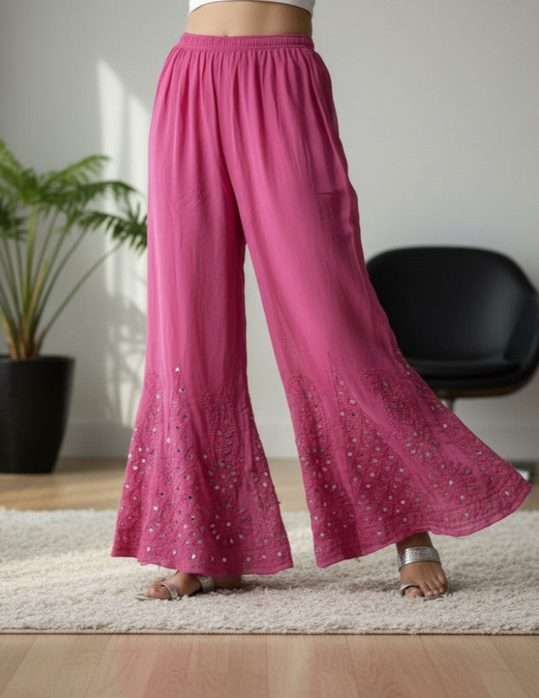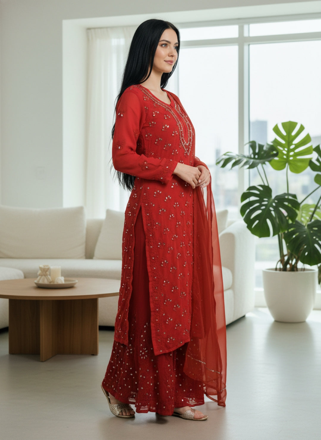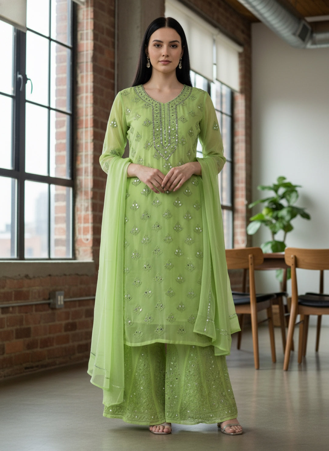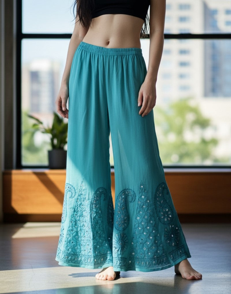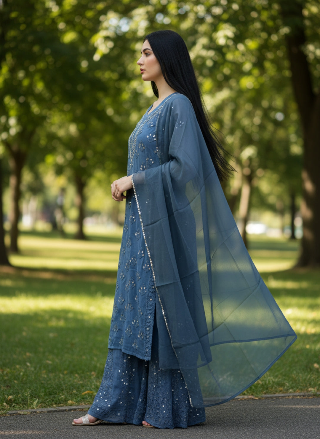 Noor-e-Chikankari Georgette Mirror Kurta Sharara set with Dupatta and Inner.