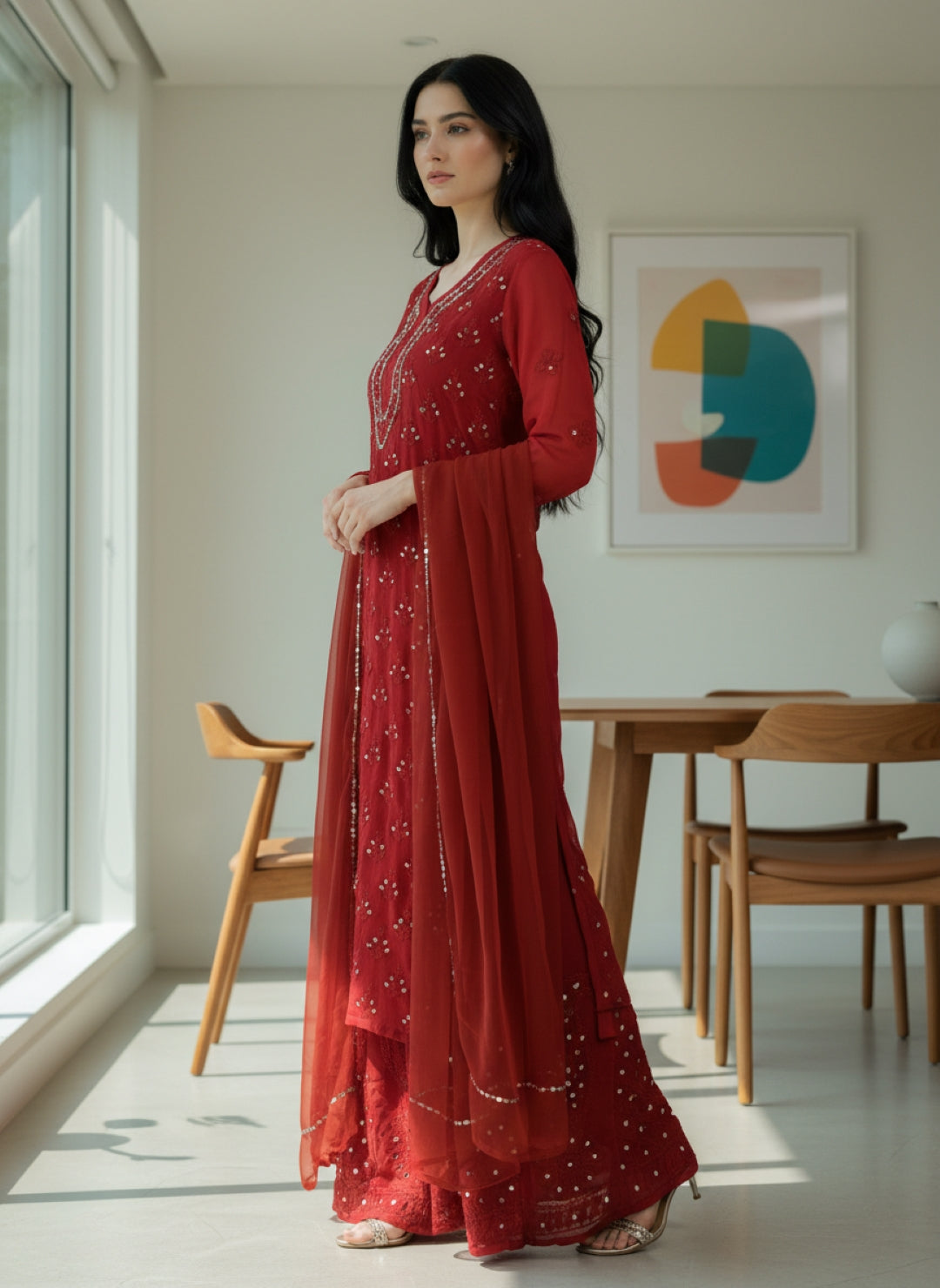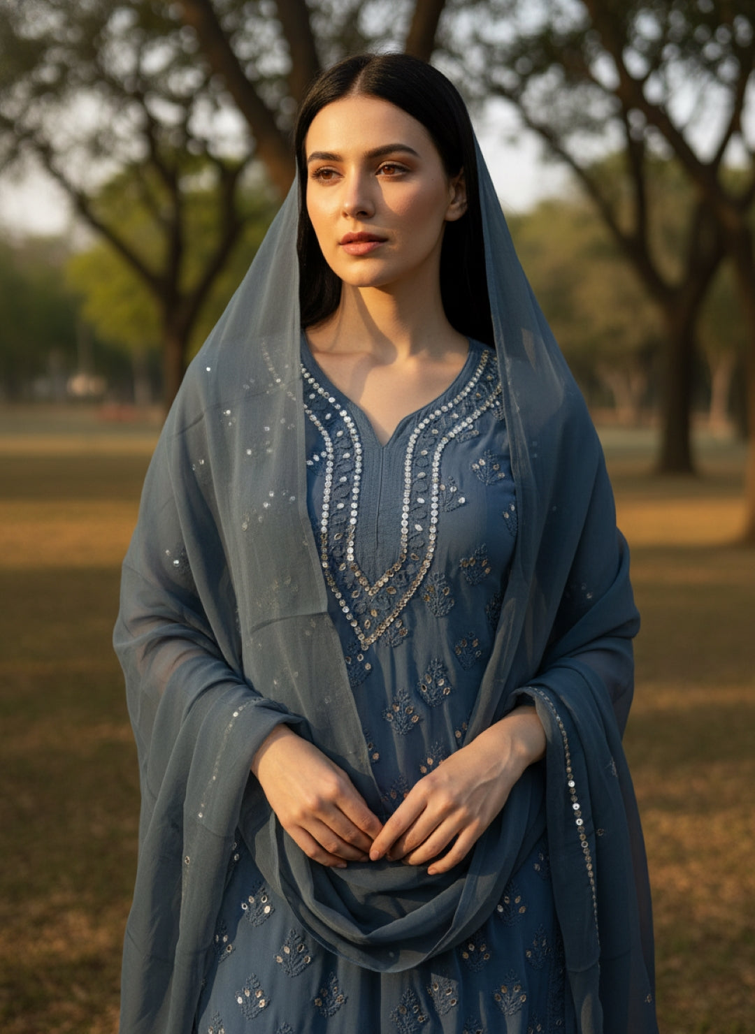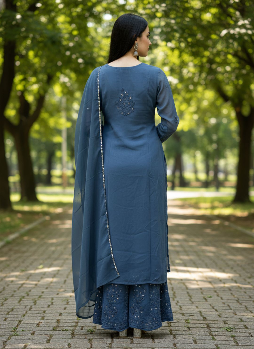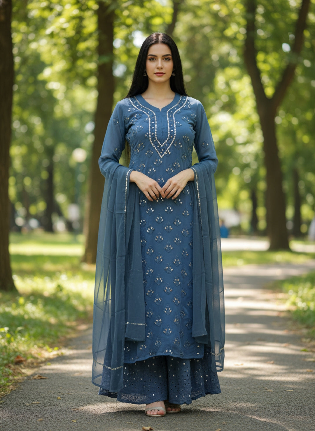 Noor-e-Chikankari Georgette Mirror Kurta Sharara set with Dupatta and Inner.