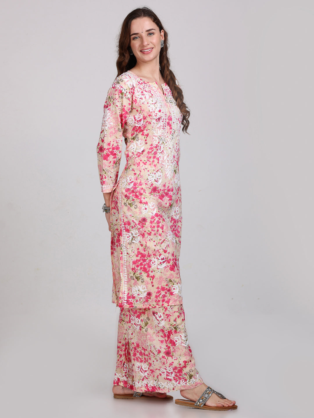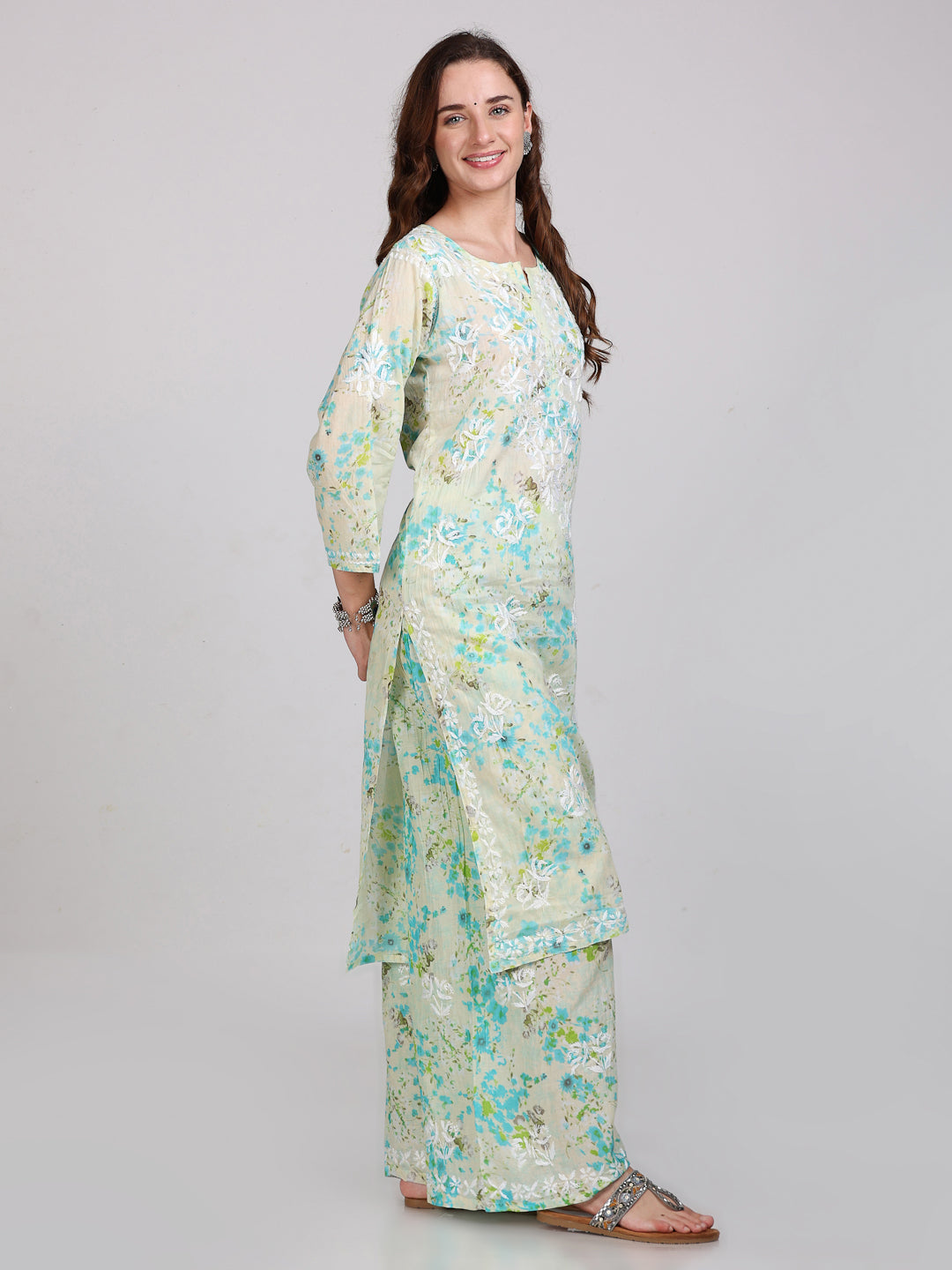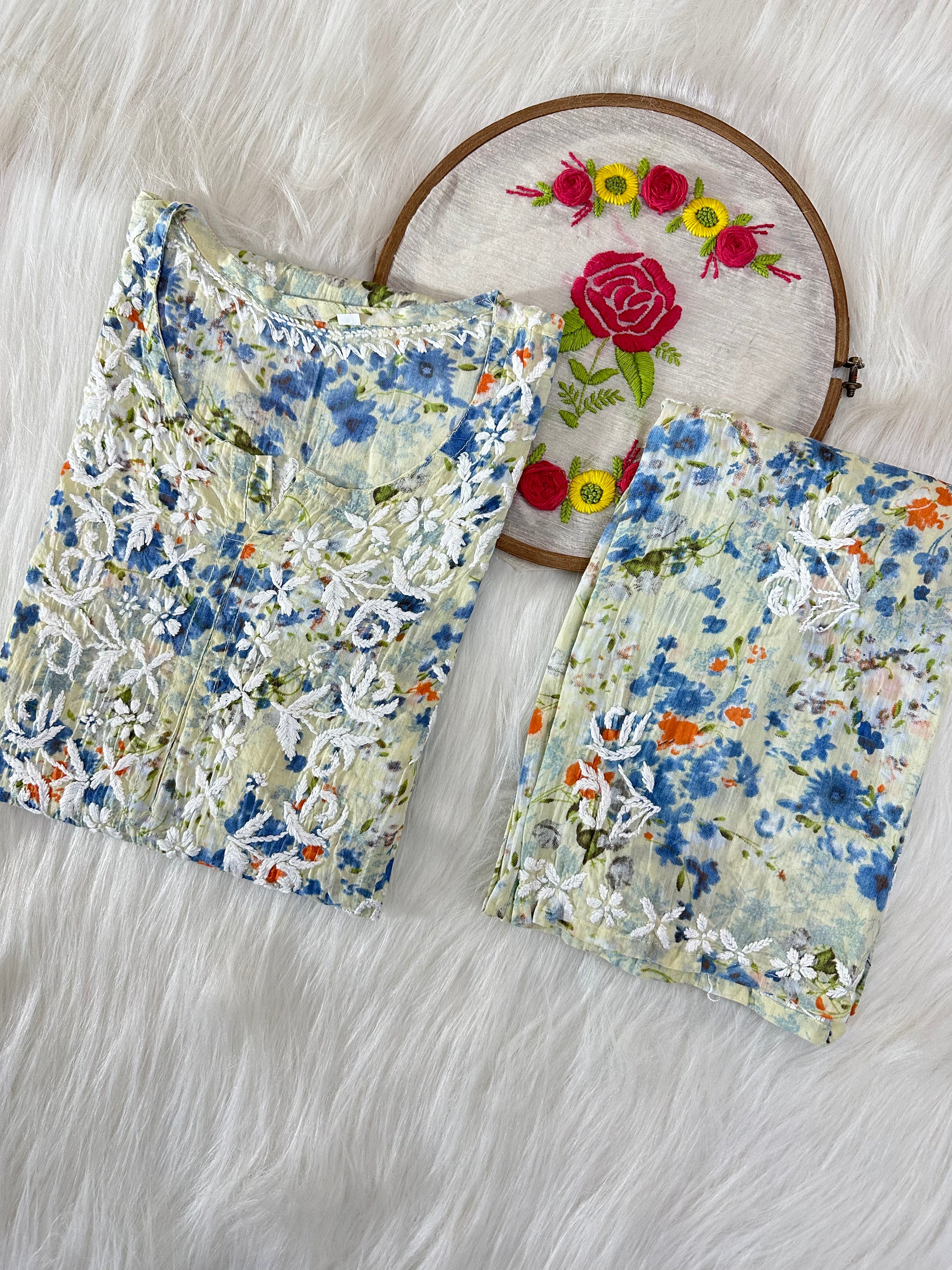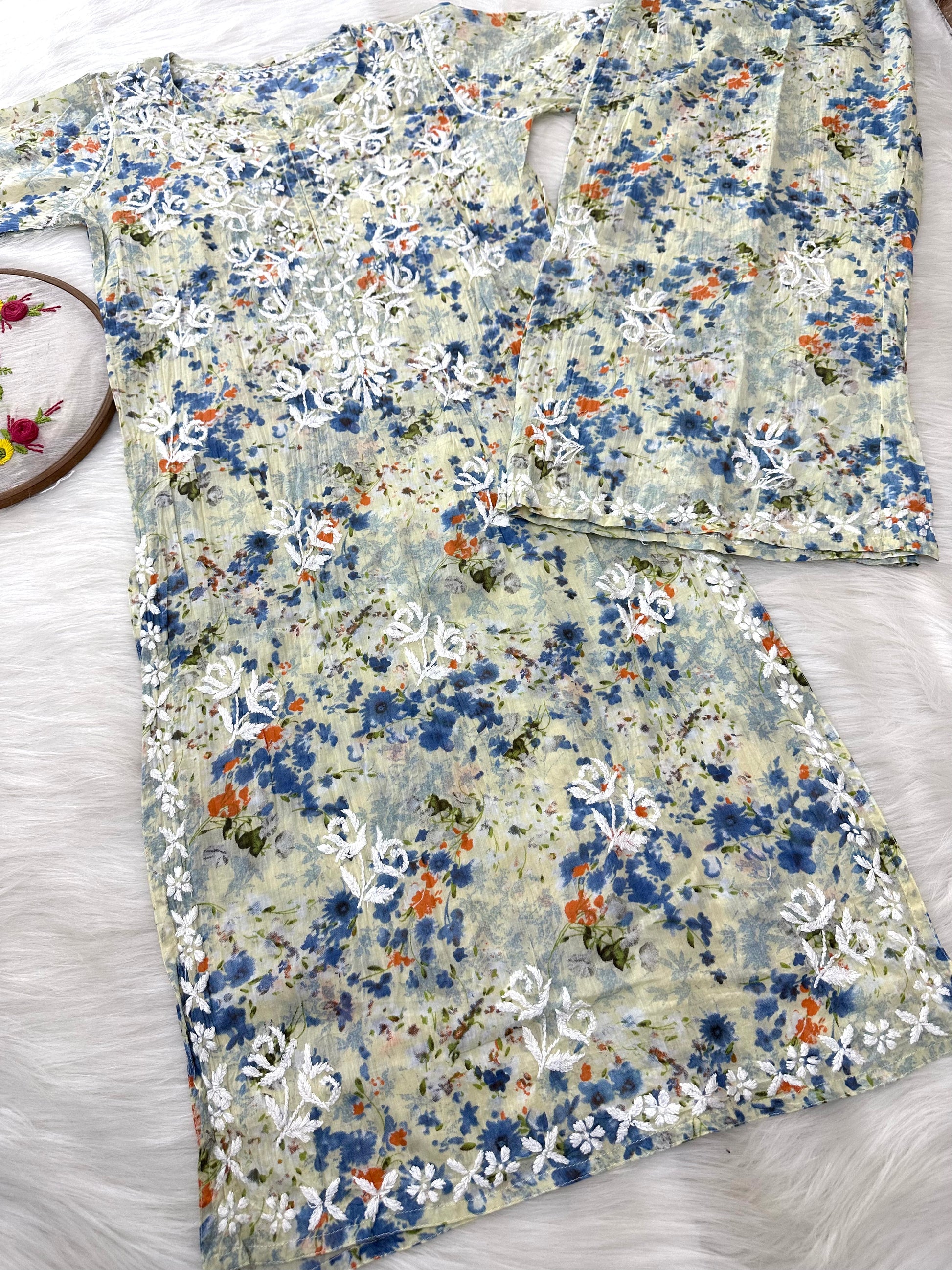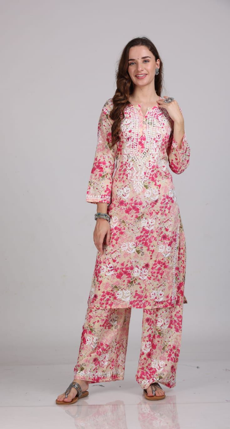 Summer Friendly Mul-Mul Floral Printed Chikankari Handwork Kurta & Stretchable Trouser