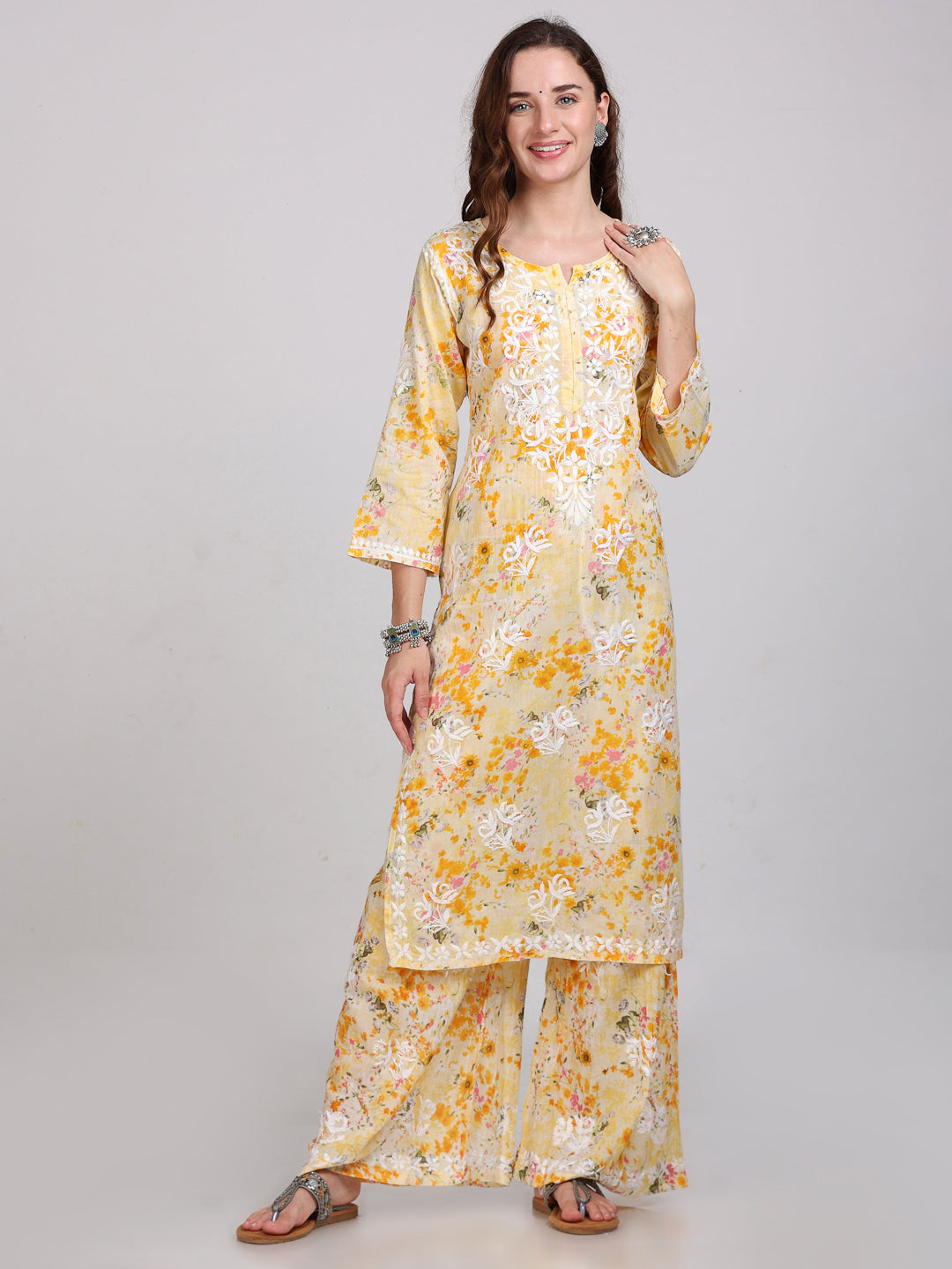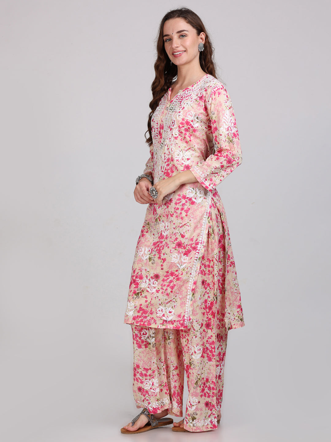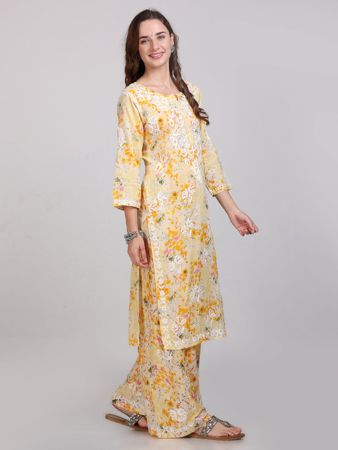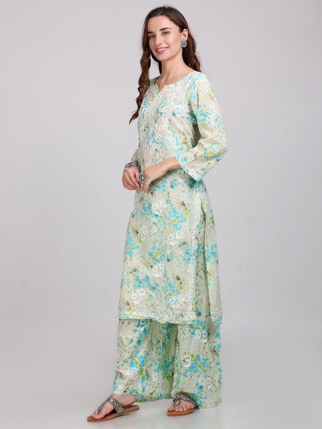 Summer Friendly Mul-Mul Floral Printed Chikankari Handwork Kurta & Stretchable Trouser