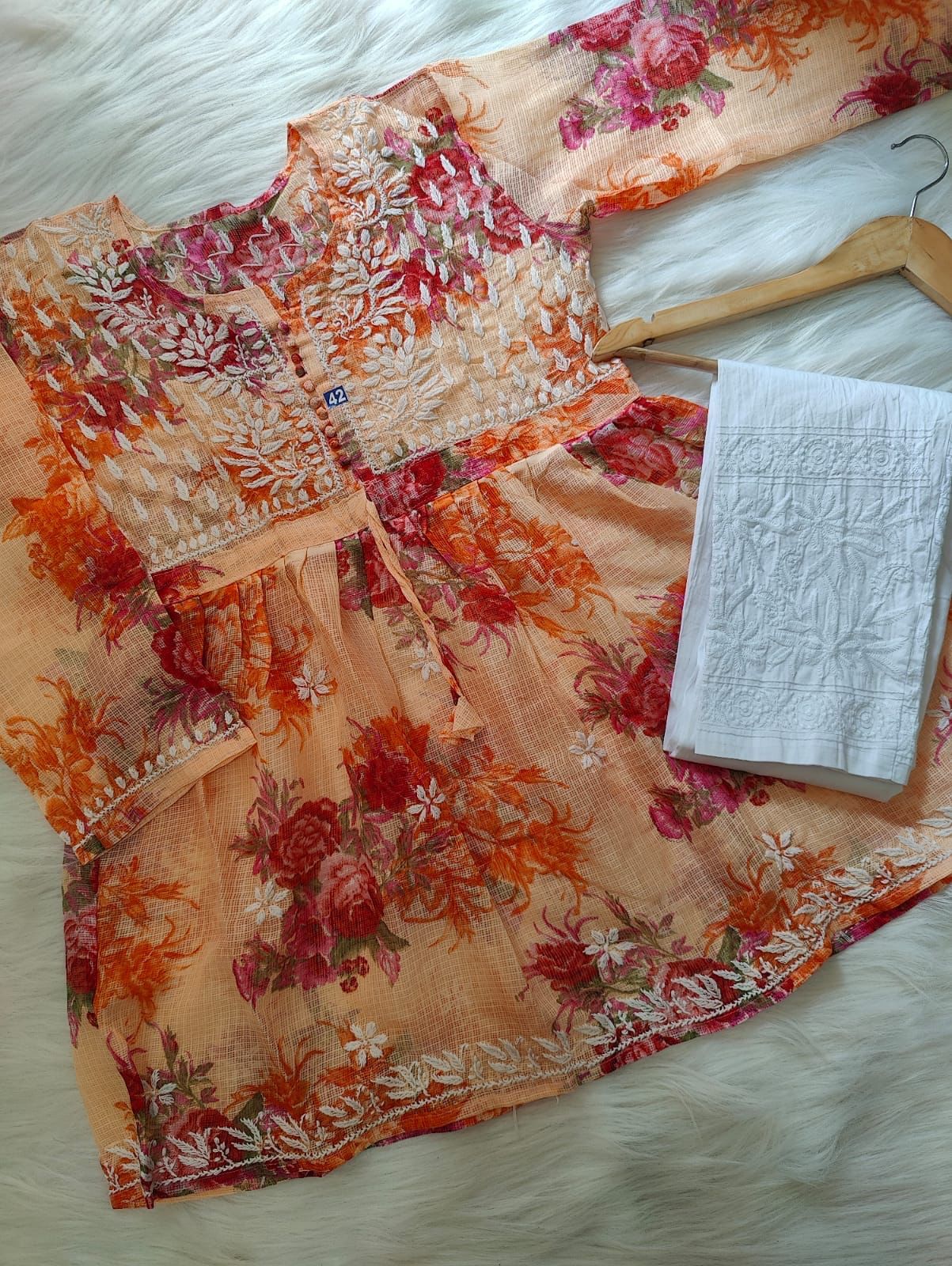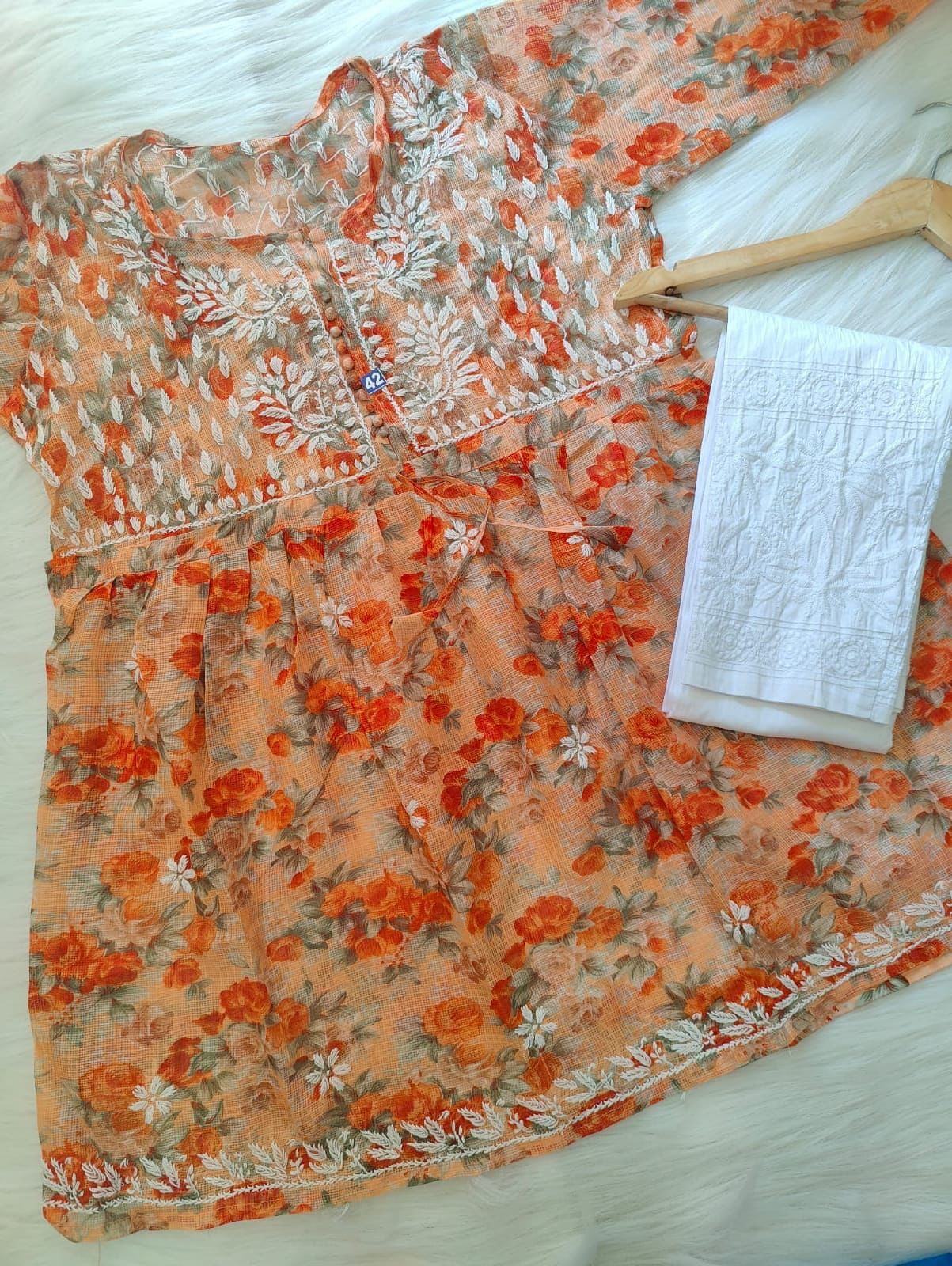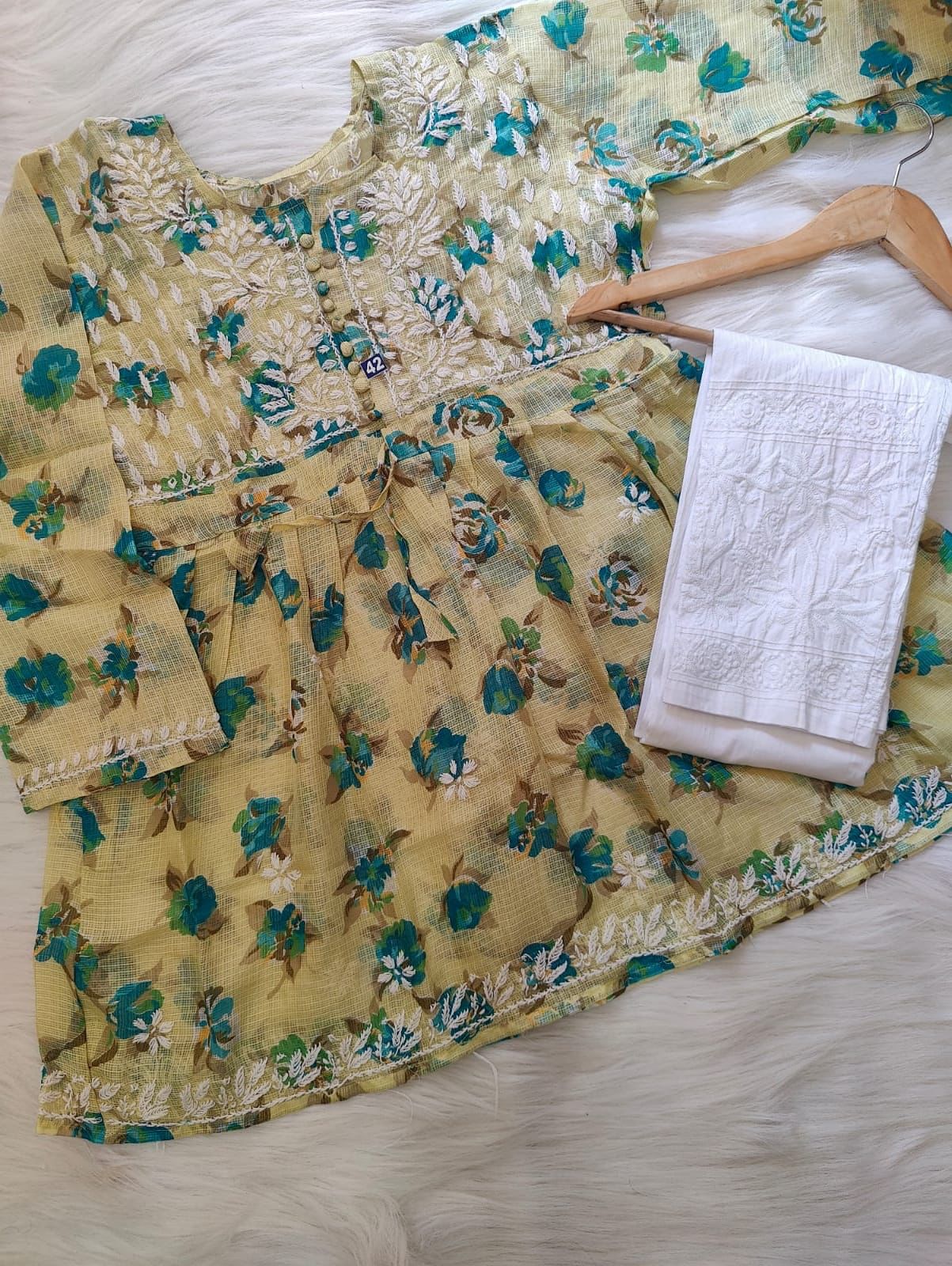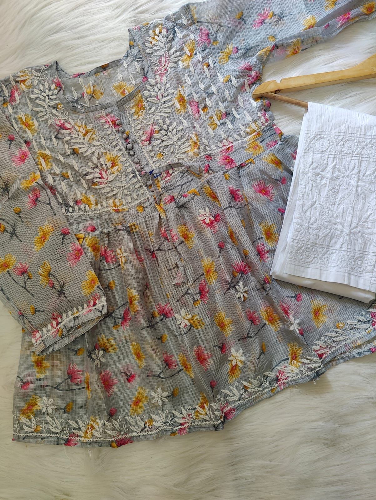 Chikanakri Floral Print Short Gown On Kota Fabric With Chikankari Lycra Stretchable Trouser