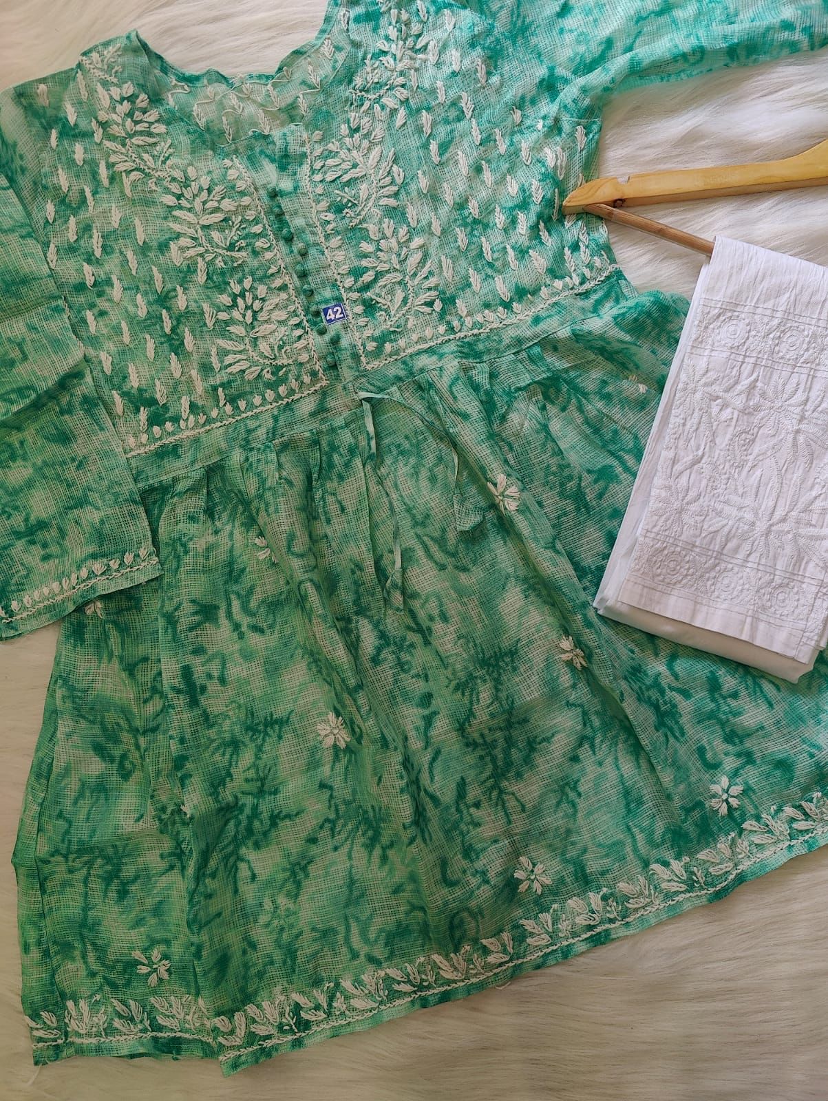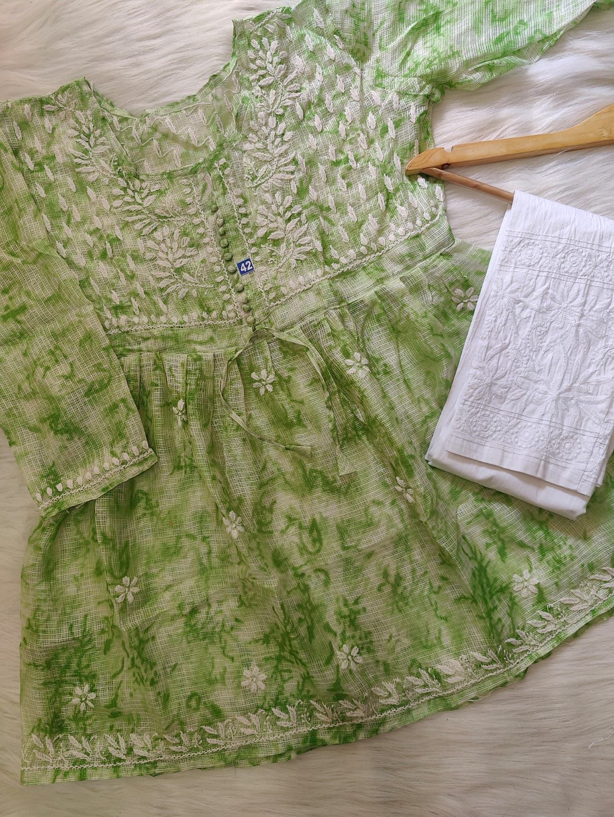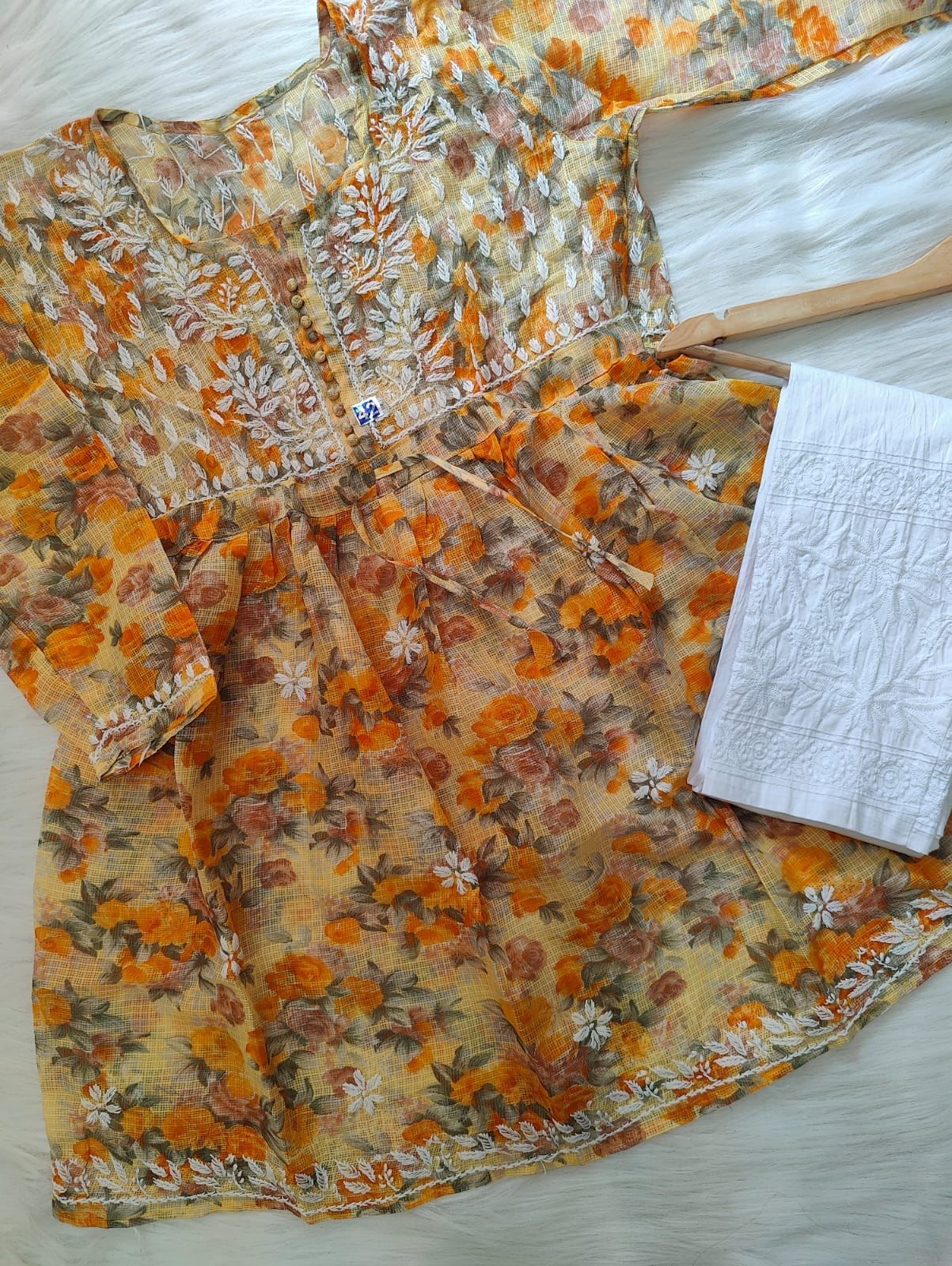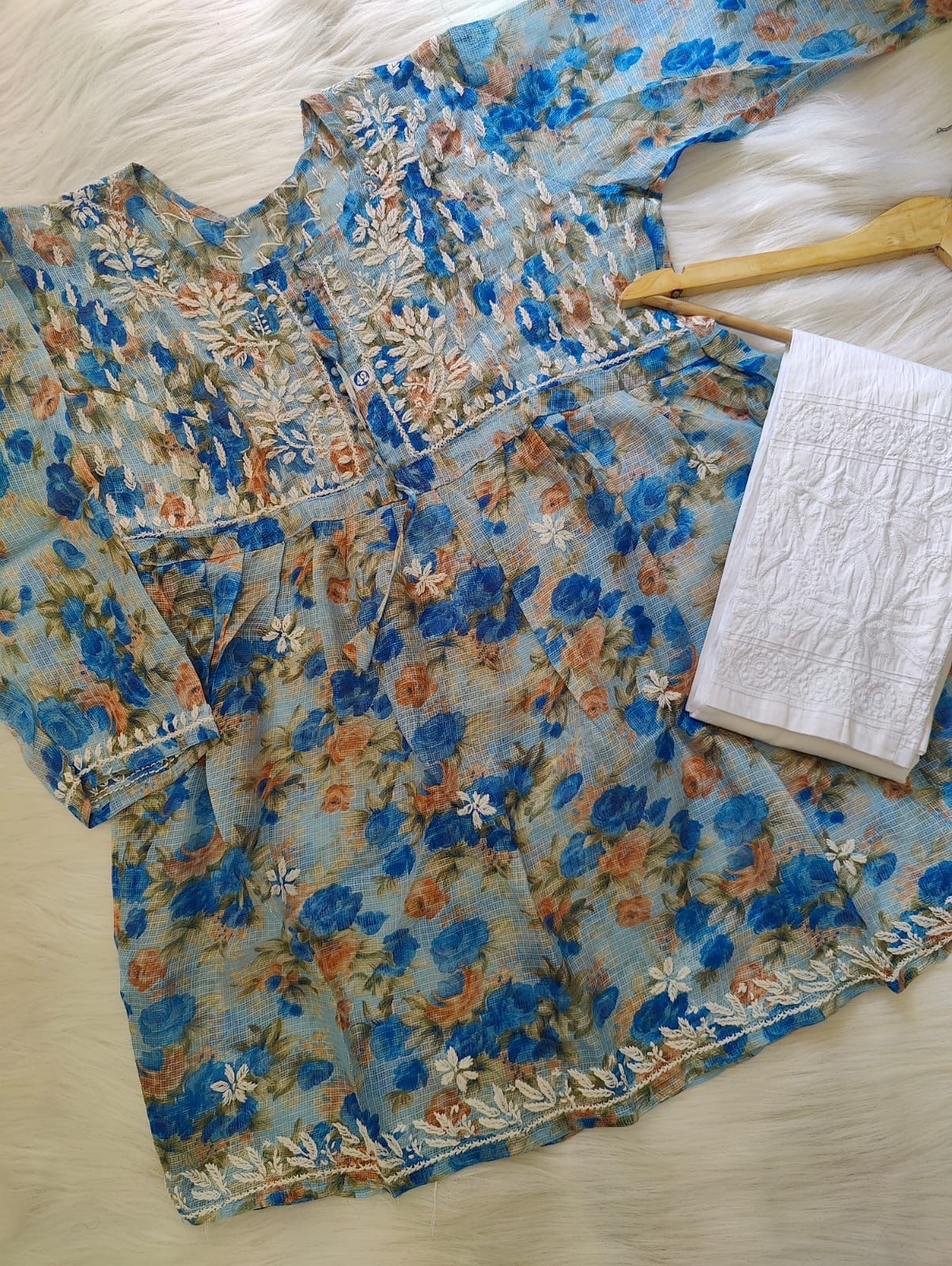 The gown is made from Kota fabric, which is a lightweight and sheer fabric originating from the Kota region in Rajasthan, India. The gown features a floral print design, showcasing intricate Chikankari embroidery. Chikankari is a traditional embroidery technique from Lucknow, known for its delicate and intricate white threadwork on fabric. The short gown typically refers to a dress that ends above the knees or mid-thigh, offering a more casual and comfortable look.