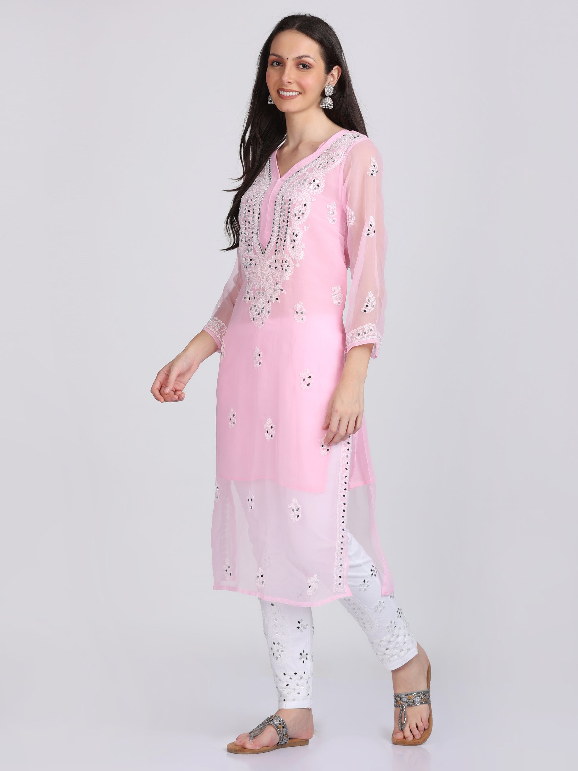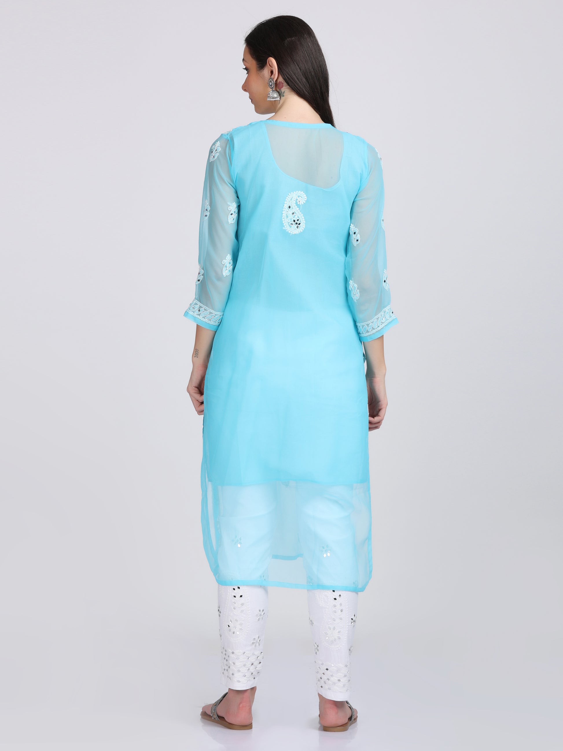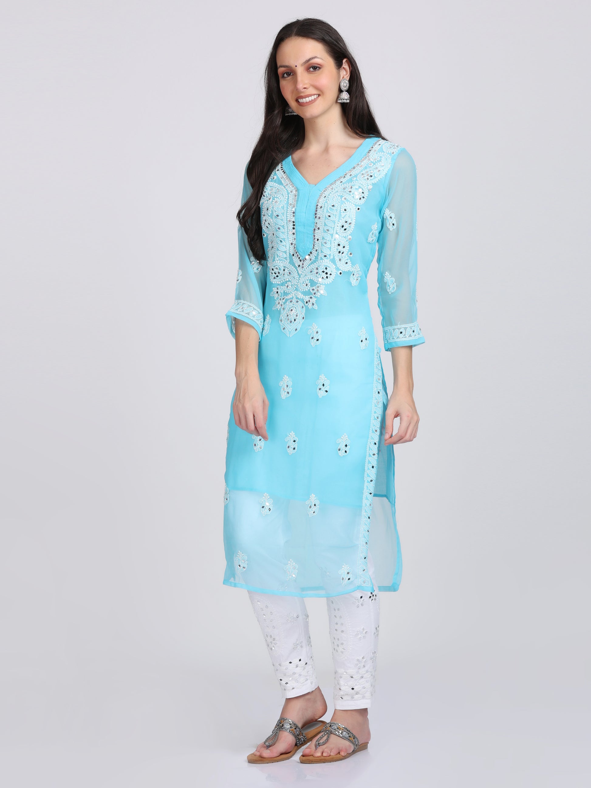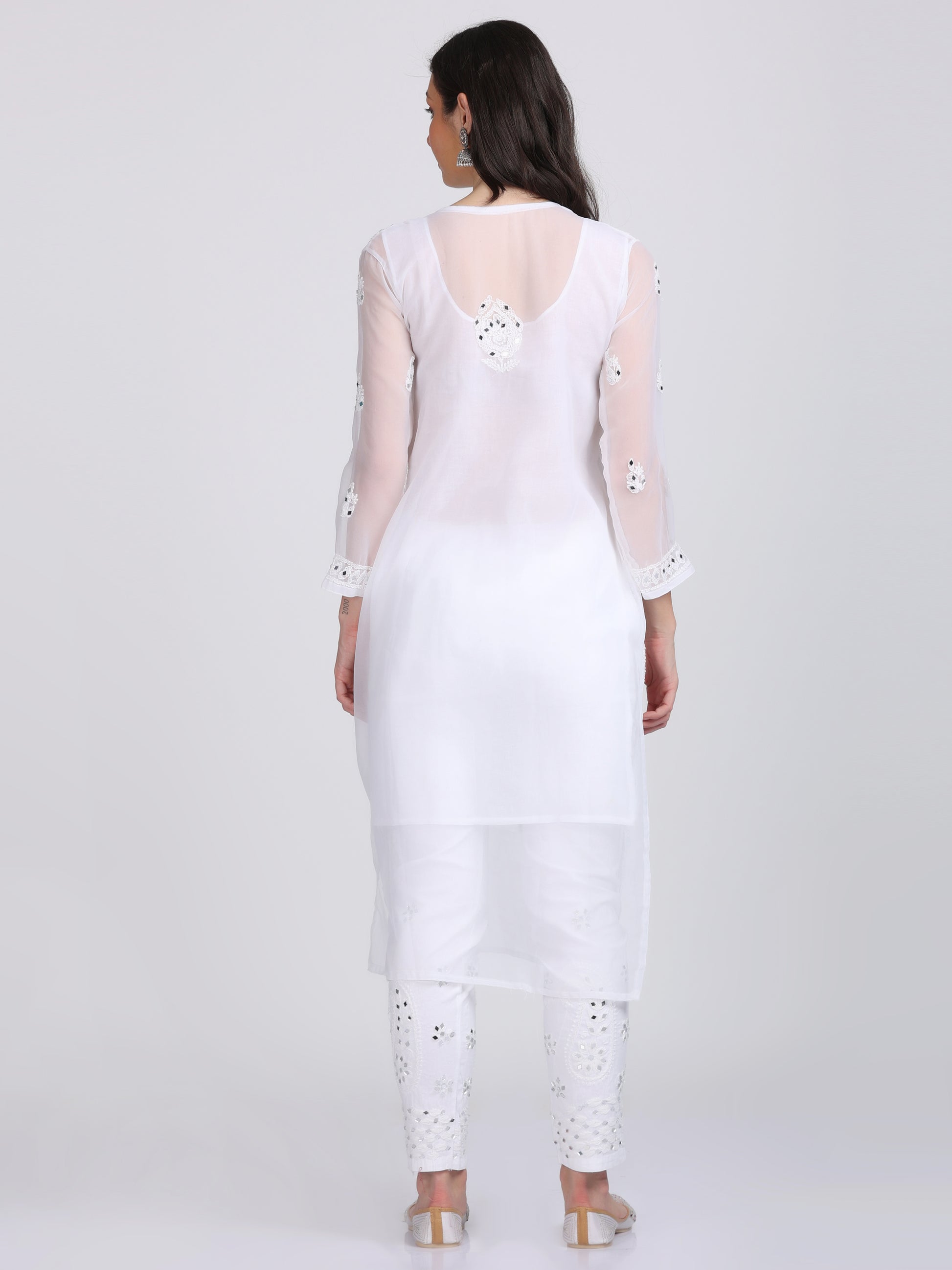 Mirror Work On Chikankari Chiffon Straight Kurta With Matching Inner