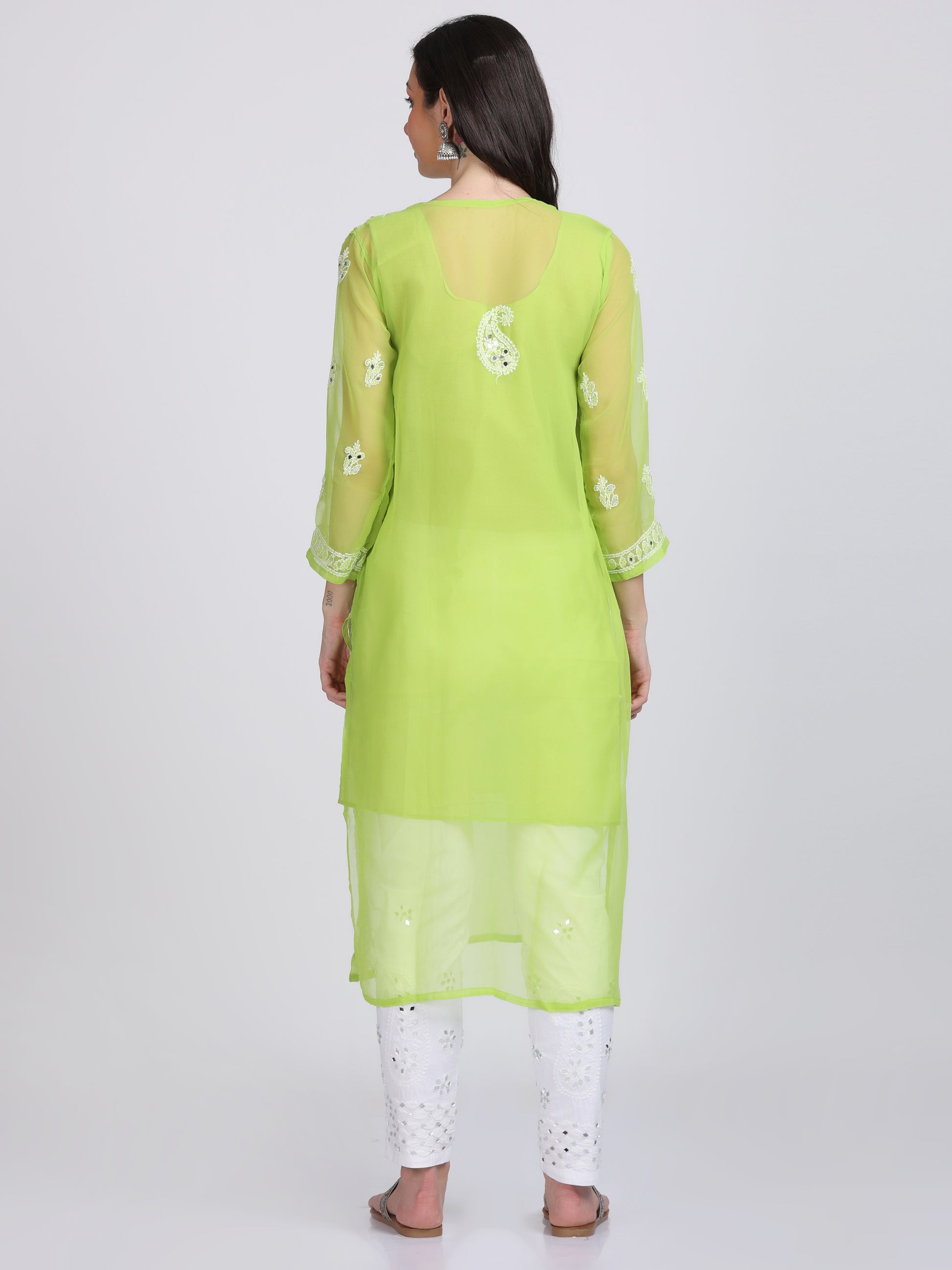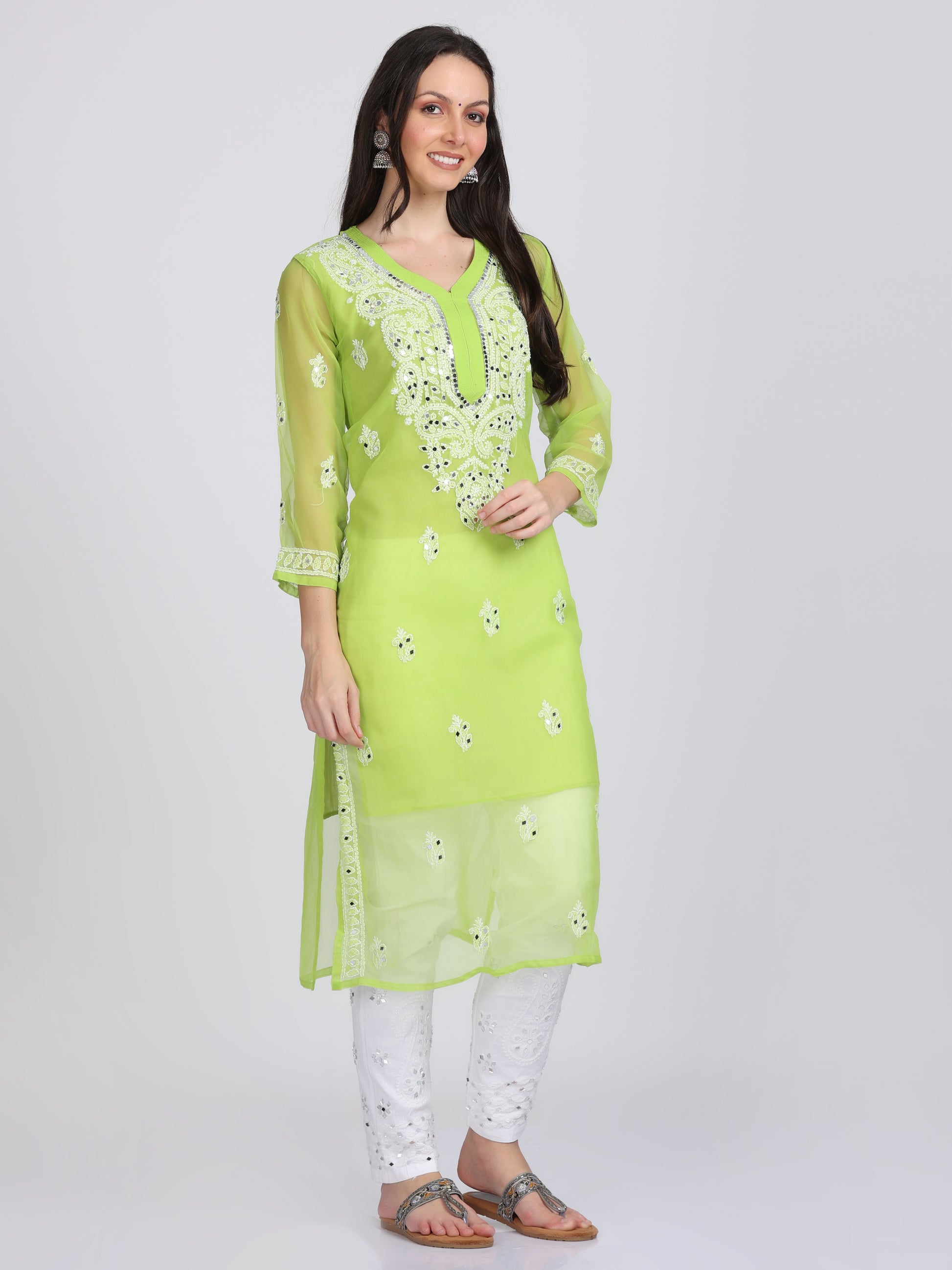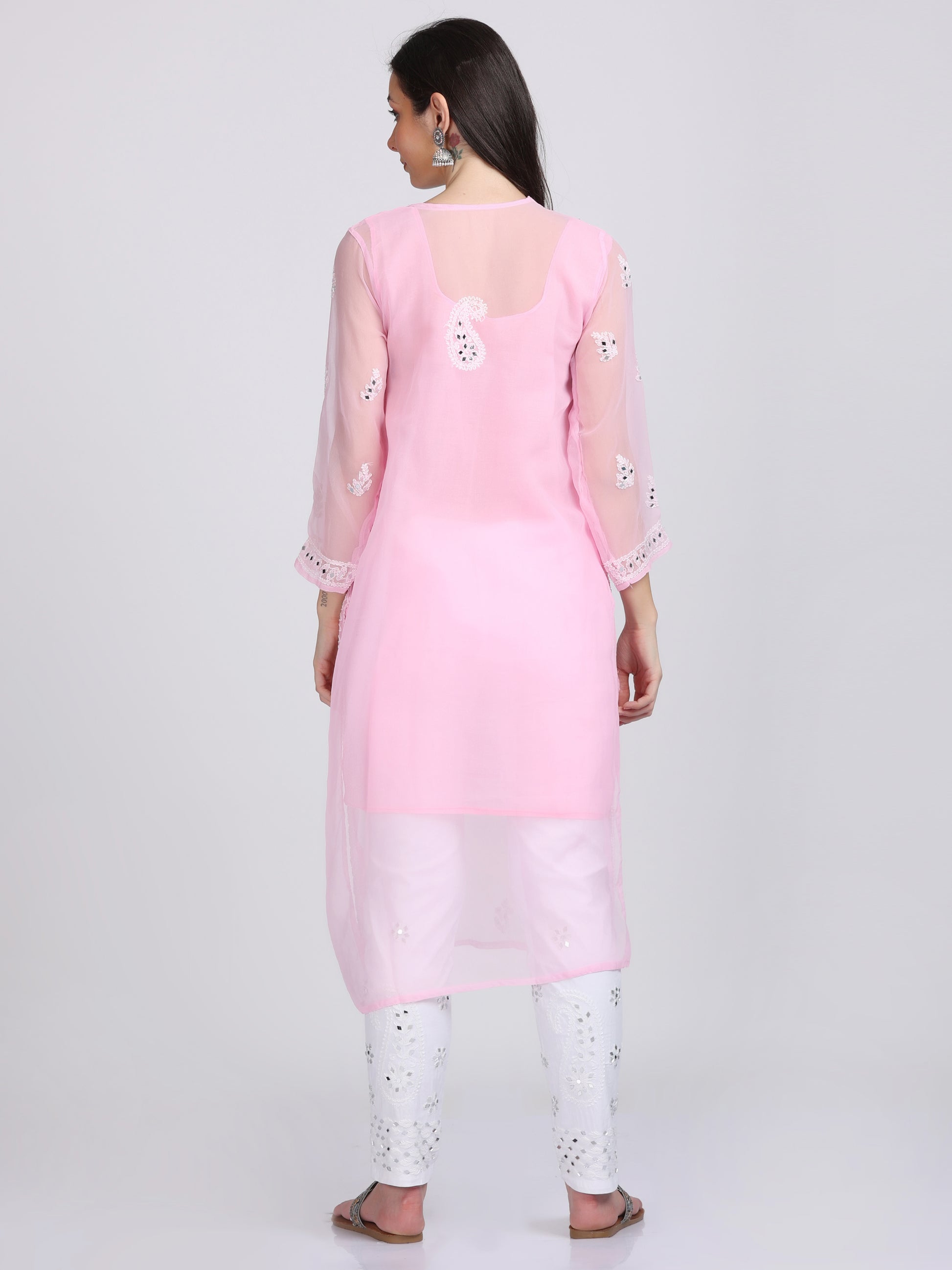 Mirror Work On Chikankari Chiffon Straight Kurta With Matching Inner
