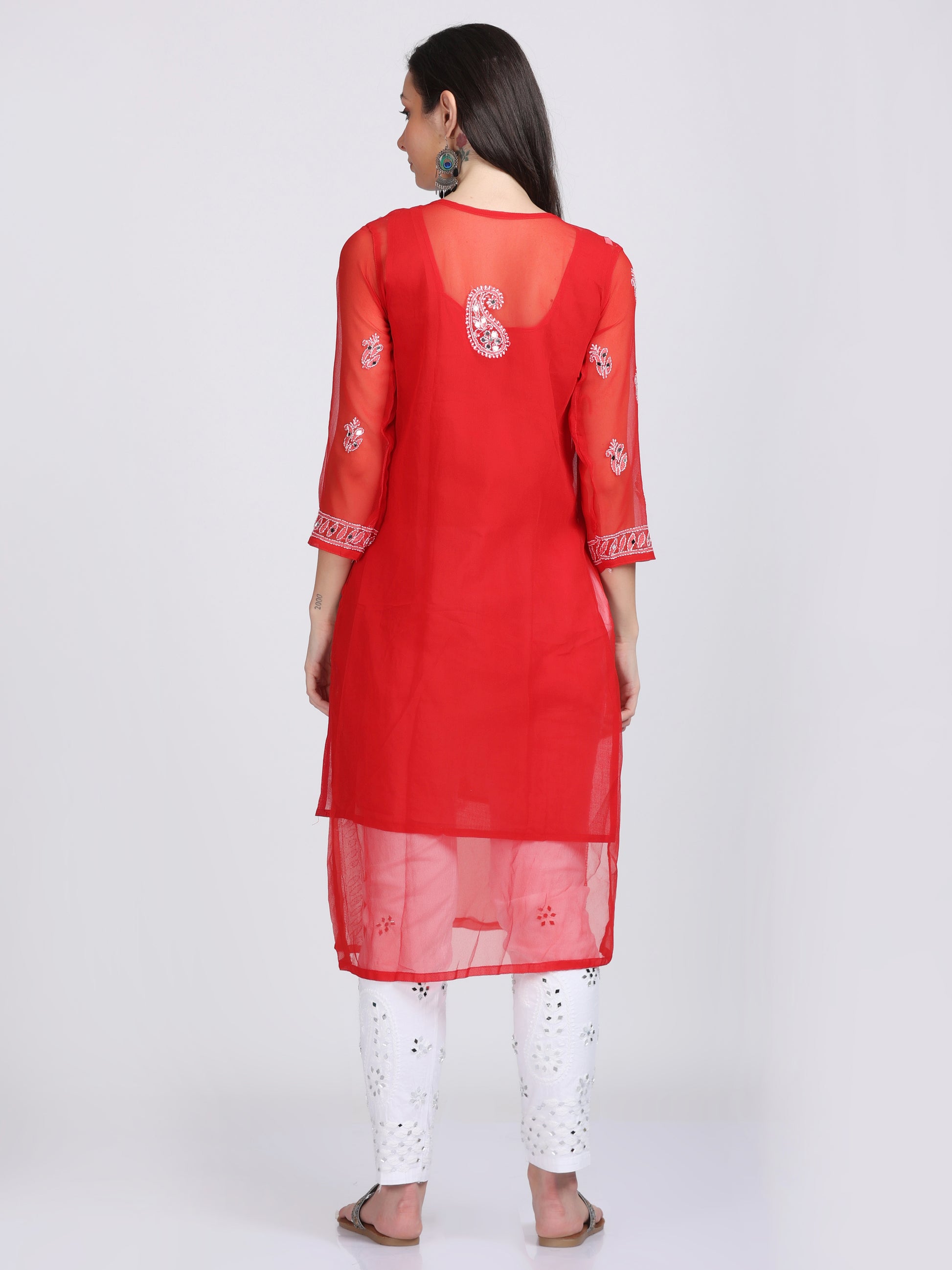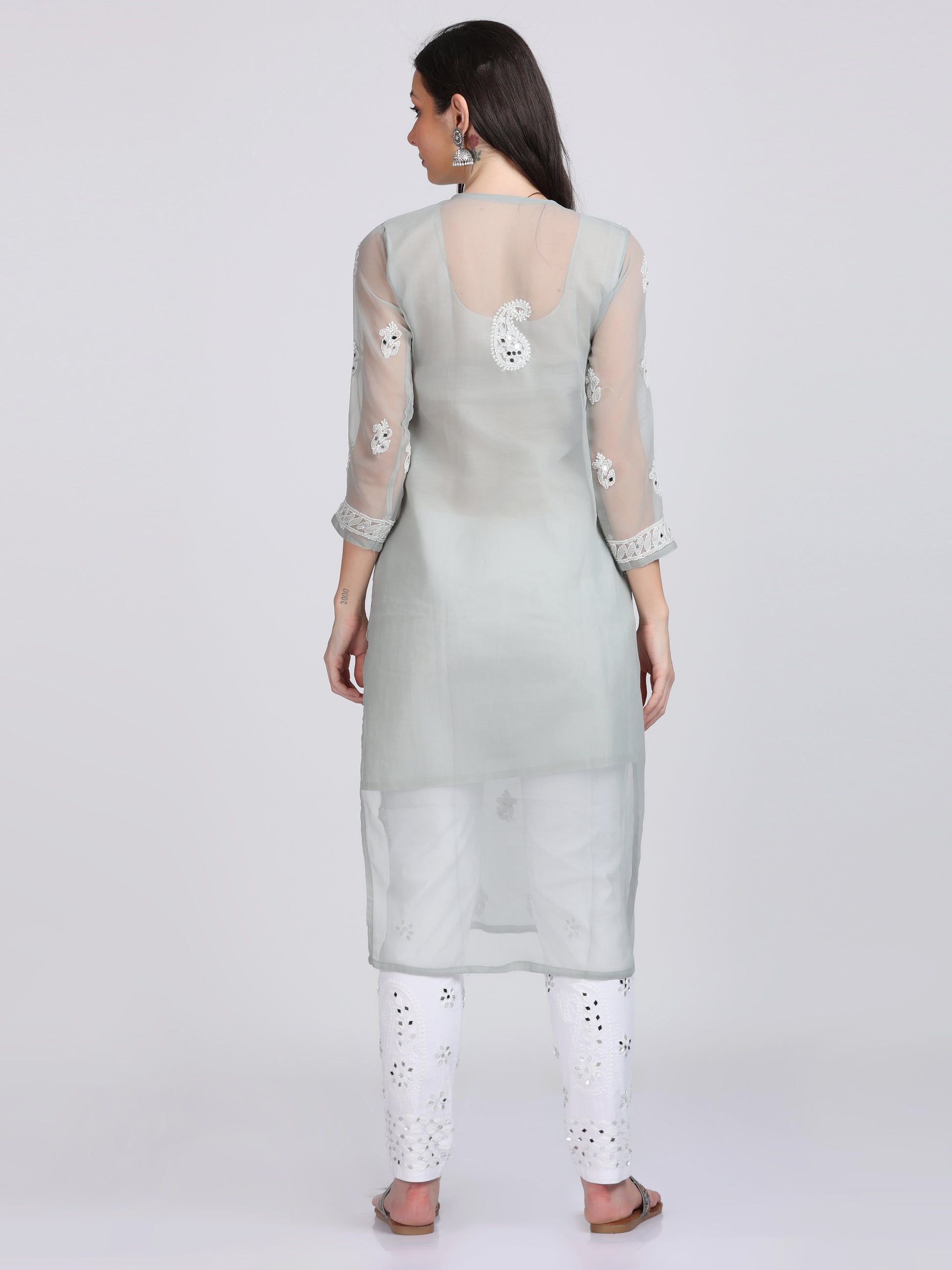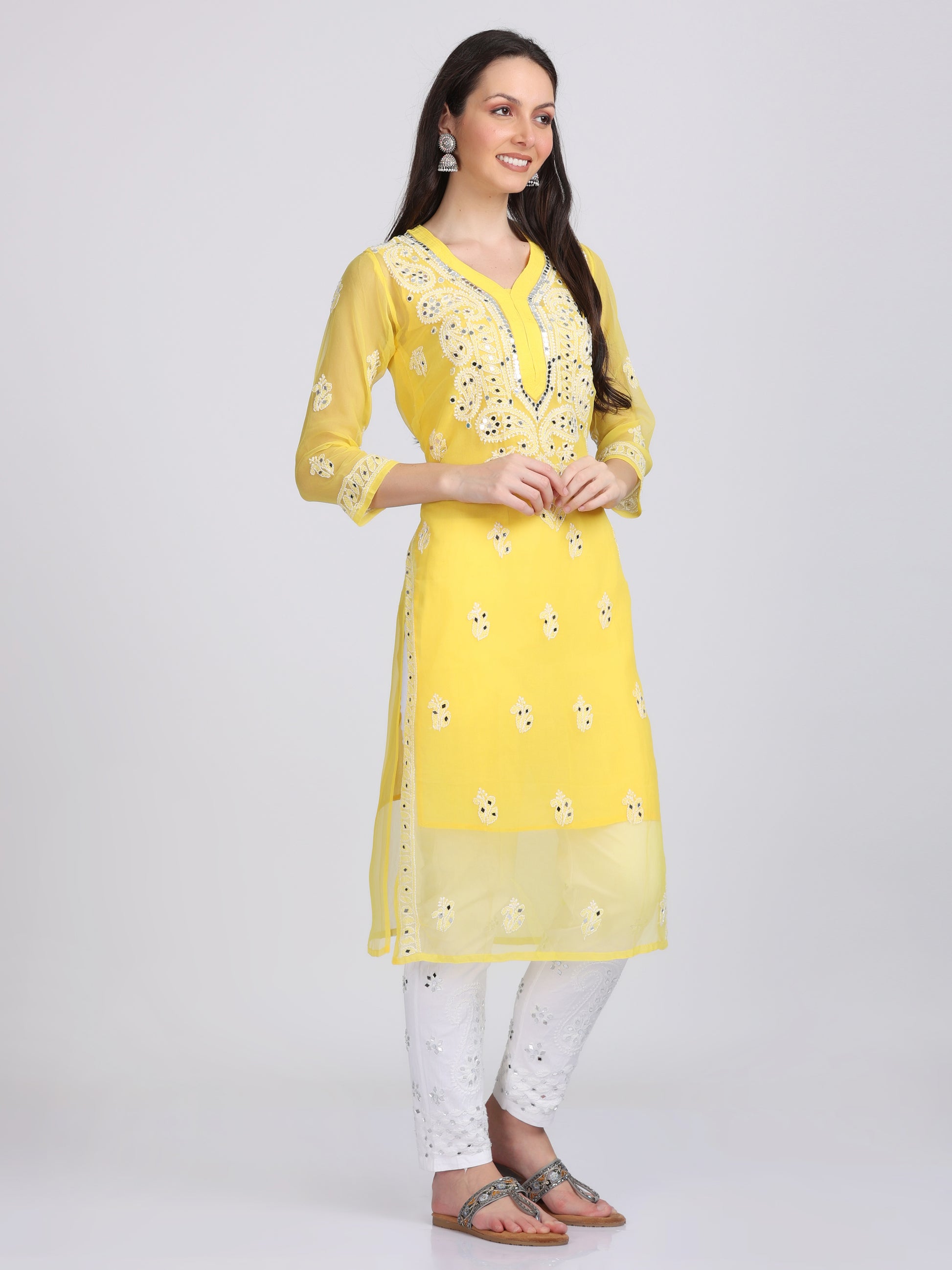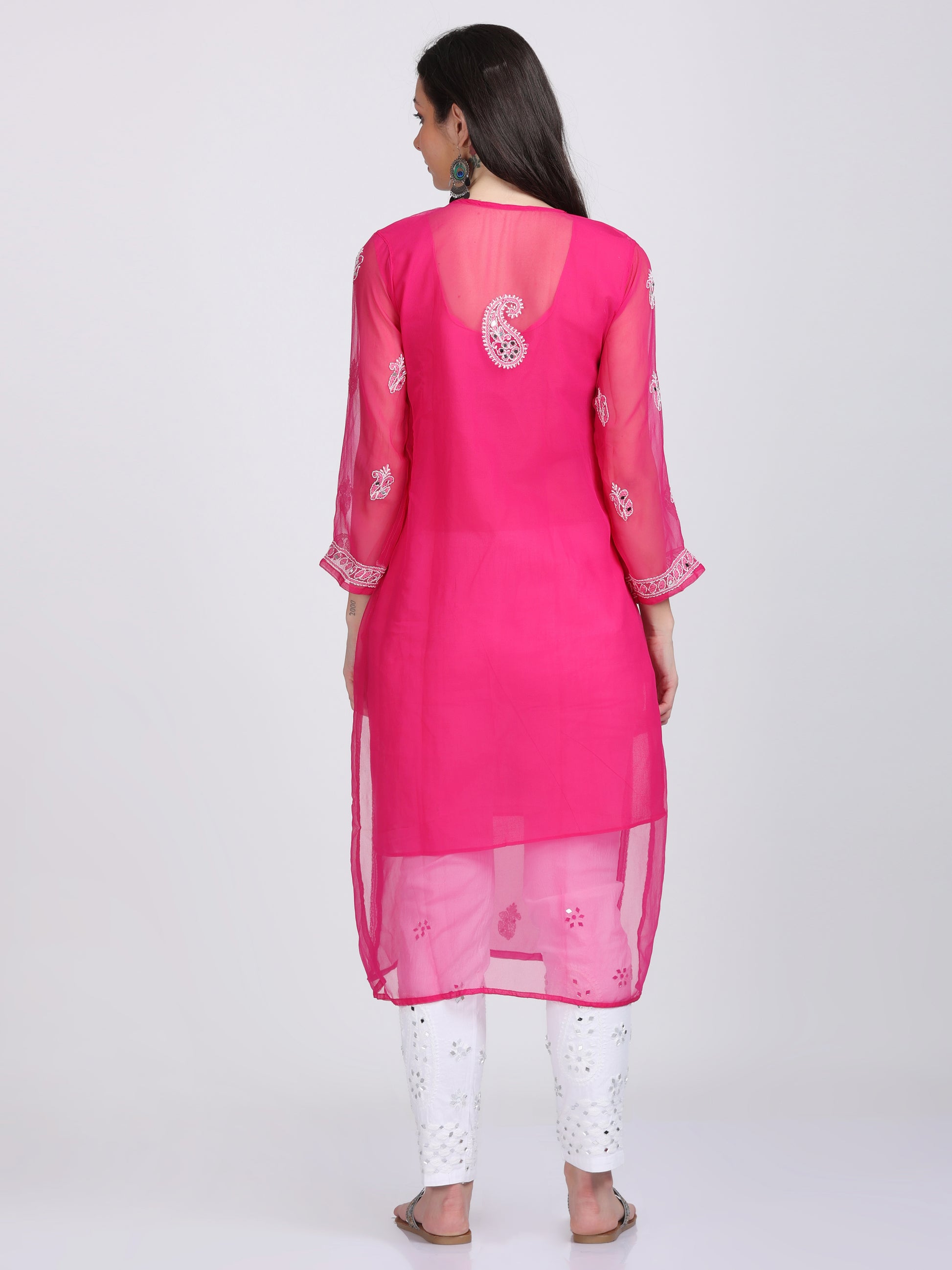 Mirror Work On Chikankari Chiffon Straight Kurta With Matching Inner