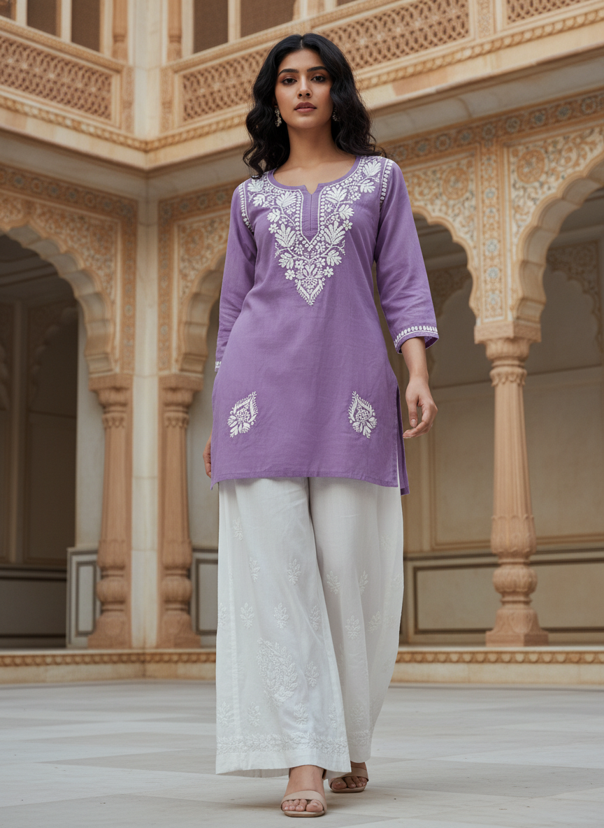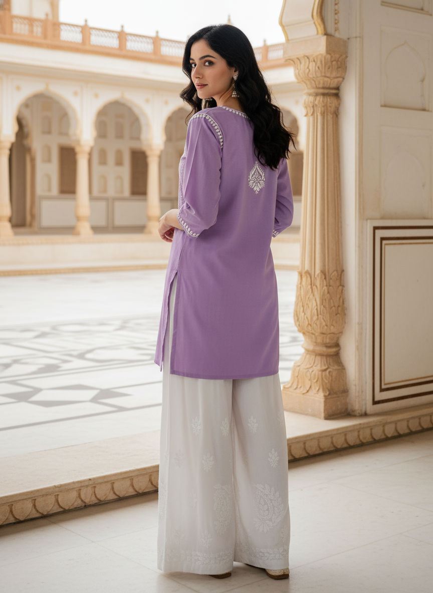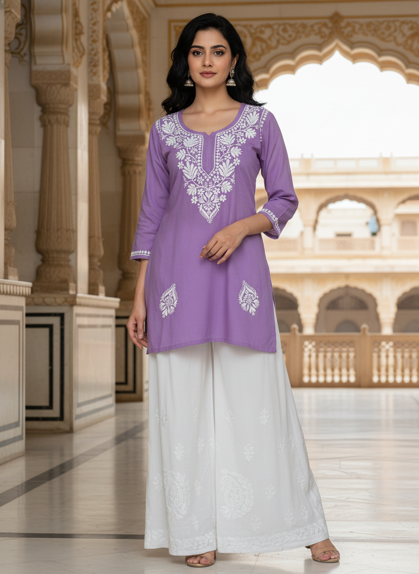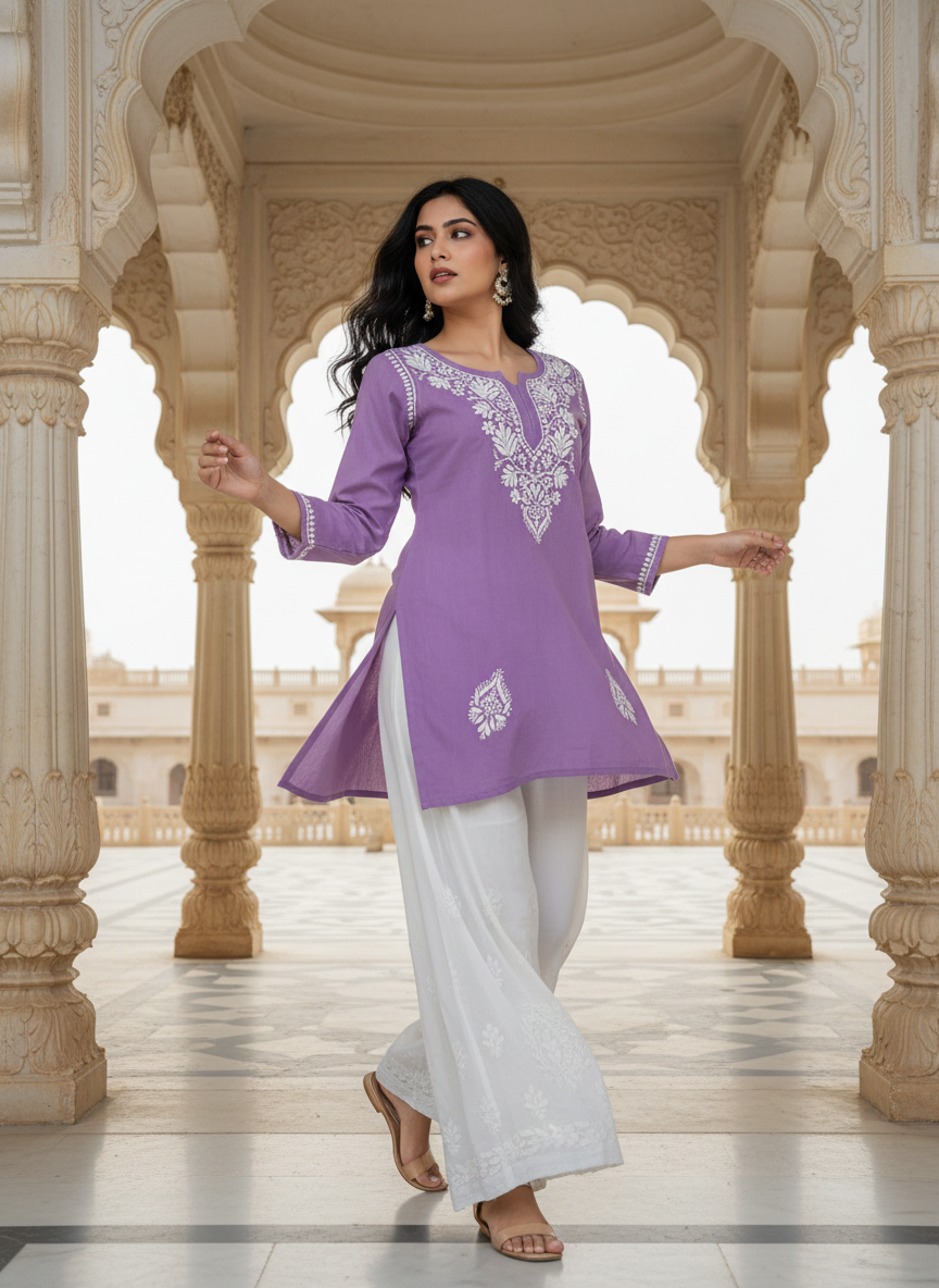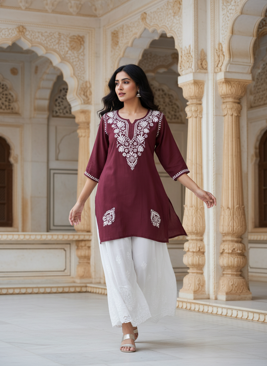 Step into effortless elegance with our Chikankari Rayon Short Dress, delicately hand-embroidered with classic white threads that celebrate the timeless beauty of Lucknowi craftsmanship.