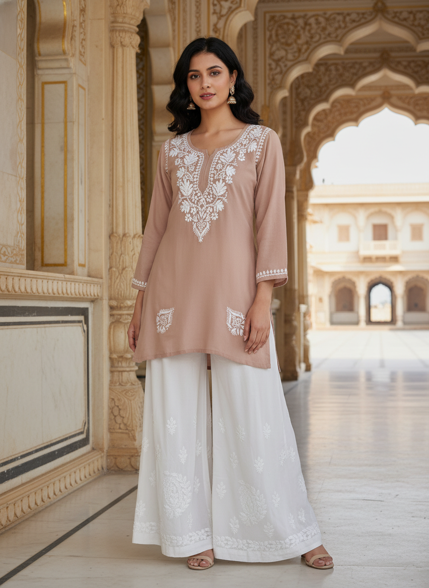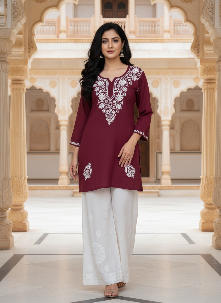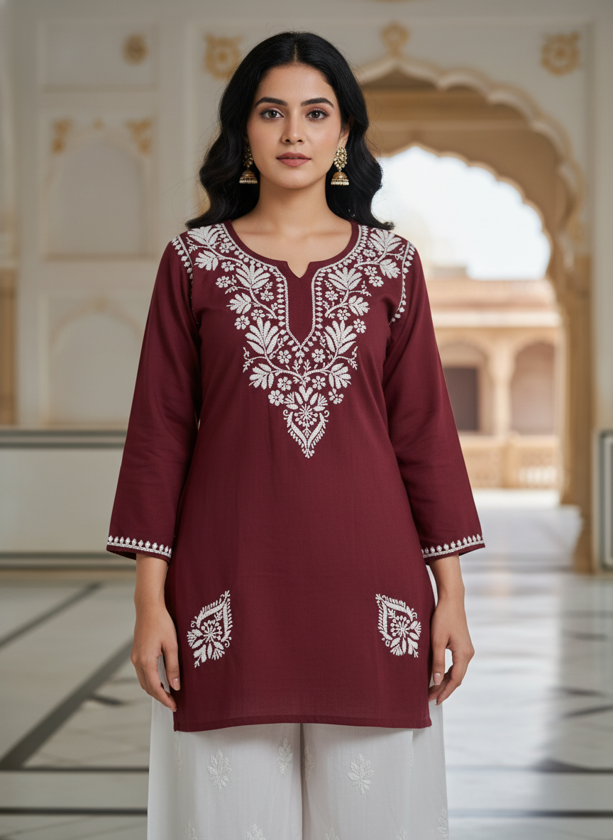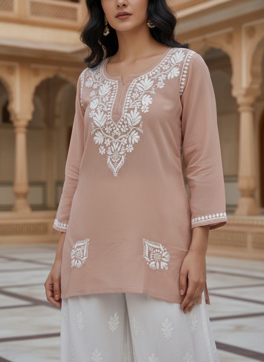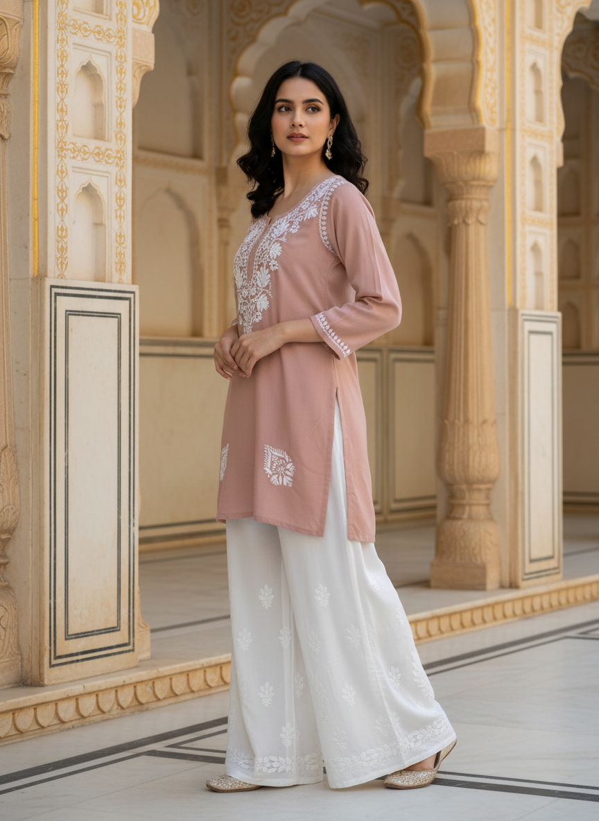 Step into effortless elegance with our Chikankari Rayon Short Dress, delicately hand-embroidered with classic white threads that celebrate the timeless beauty of Lucknowi craftsmanship.
