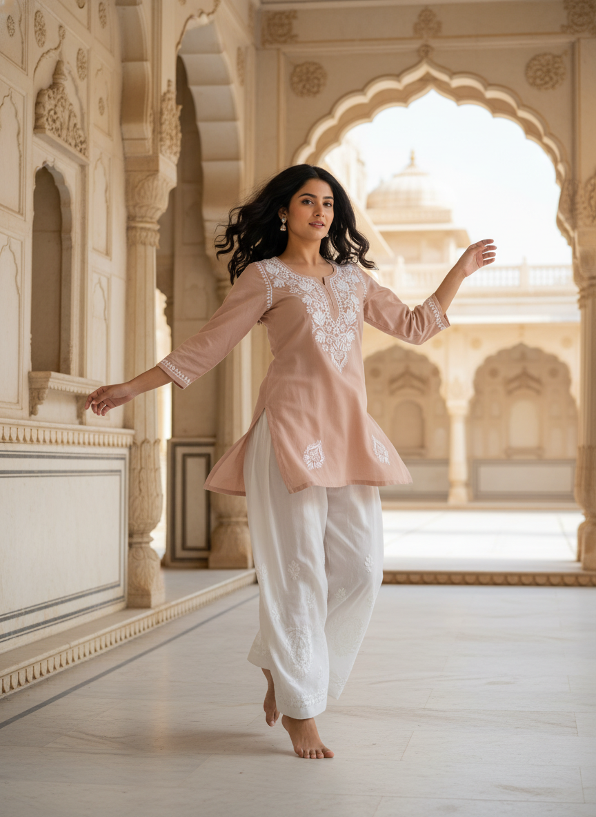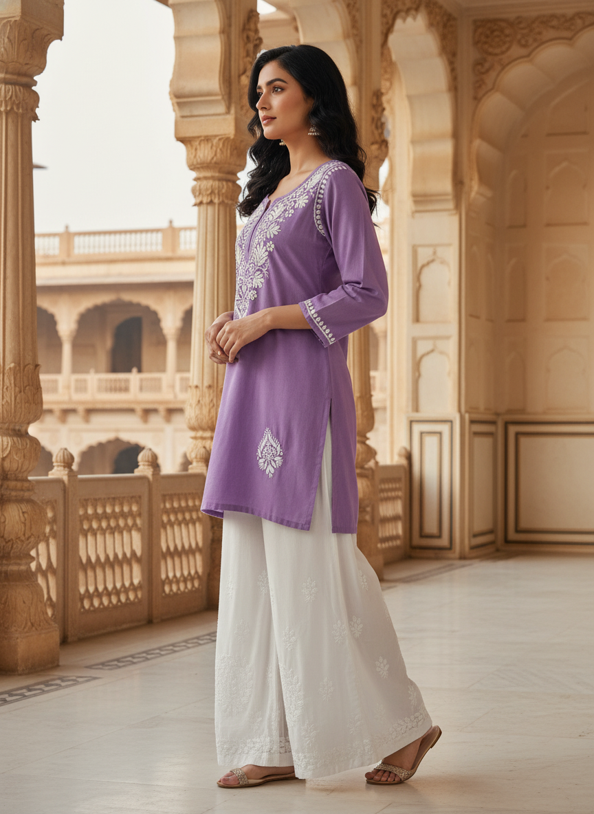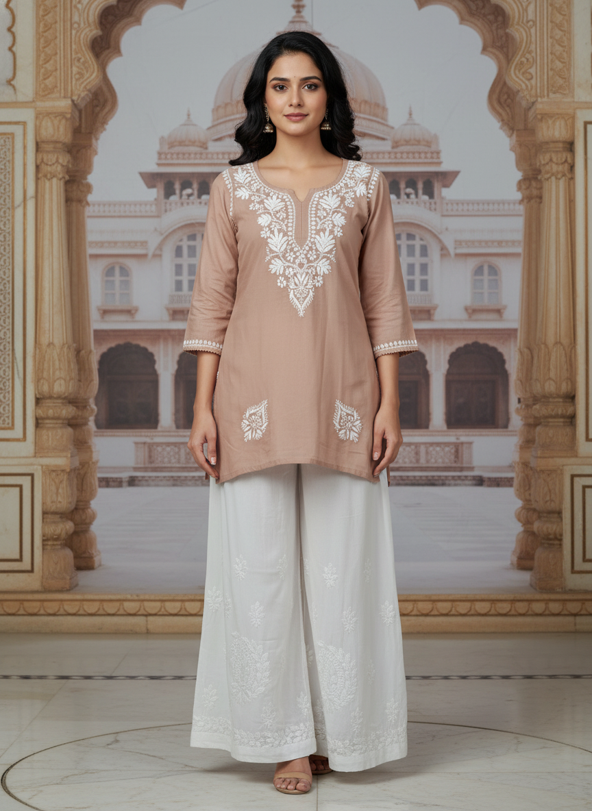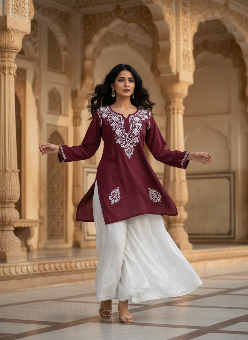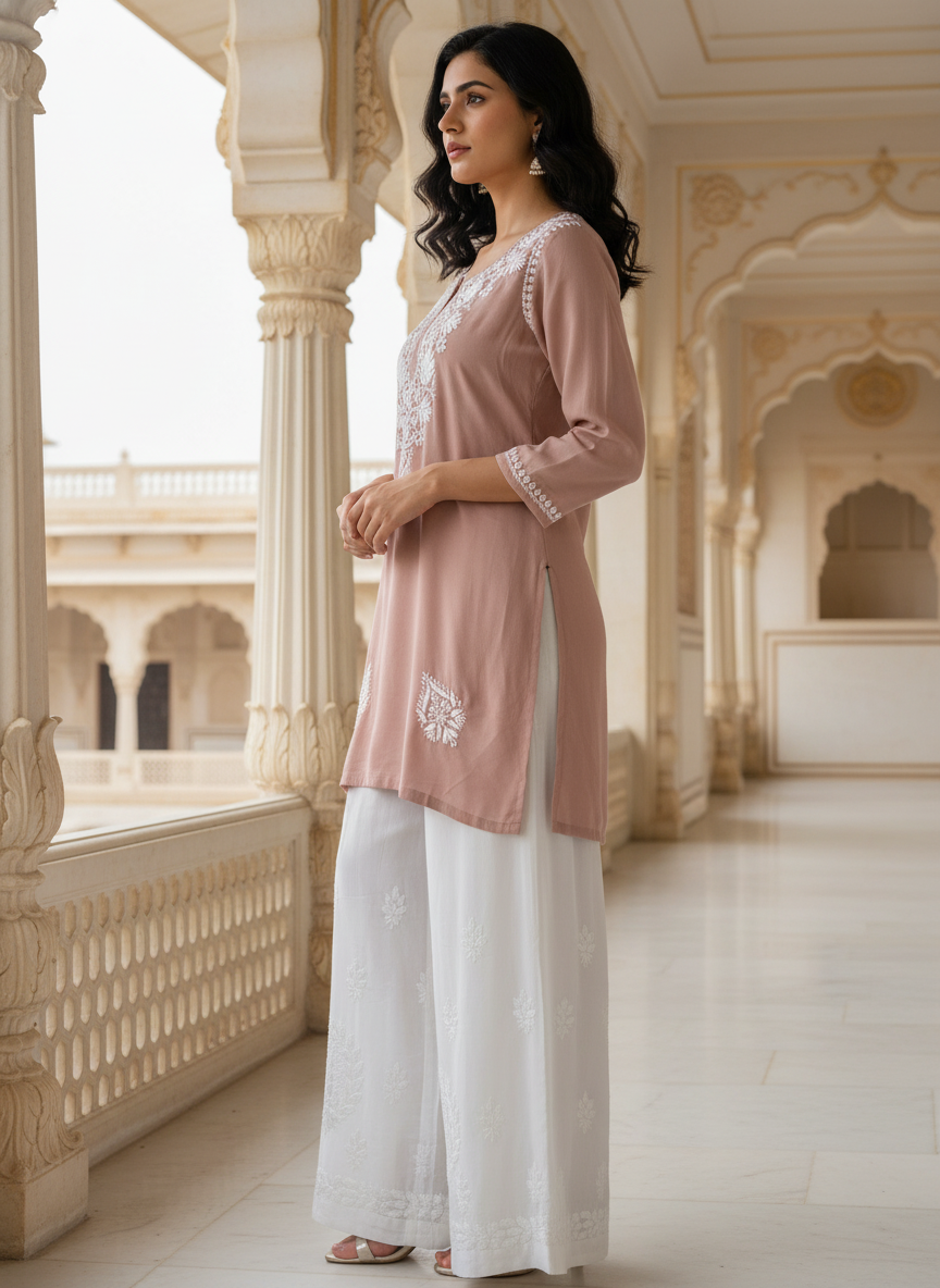 Step into effortless elegance with our Chikankari Rayon Short Dress, delicately hand-embroidered with classic white threads that celebrate the timeless beauty of Lucknowi craftsmanship.