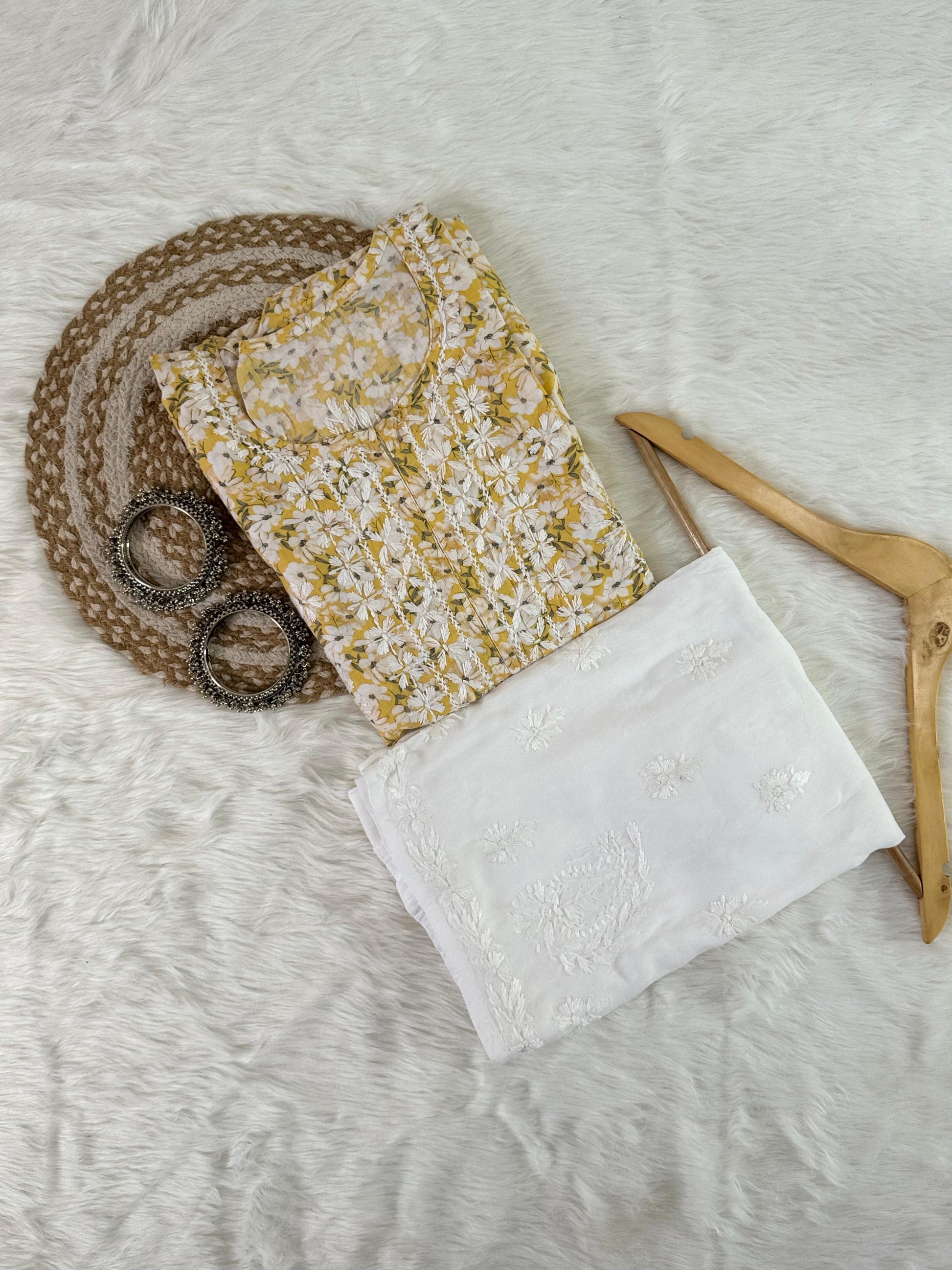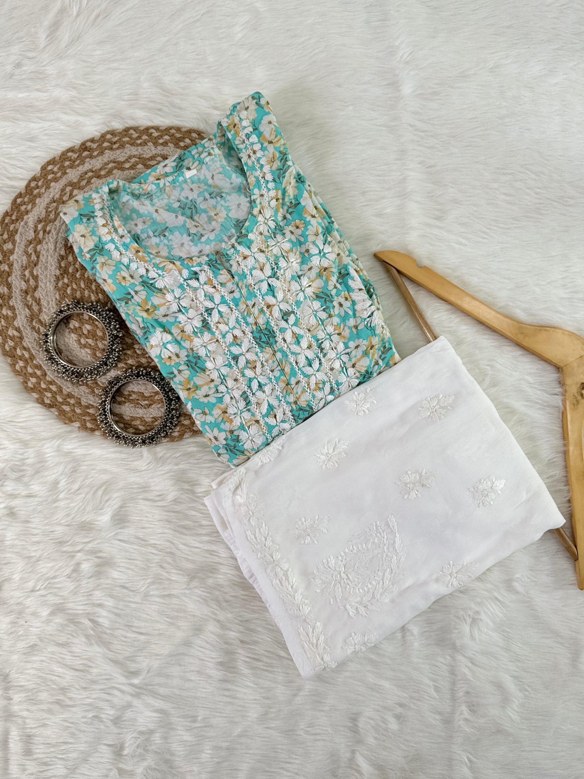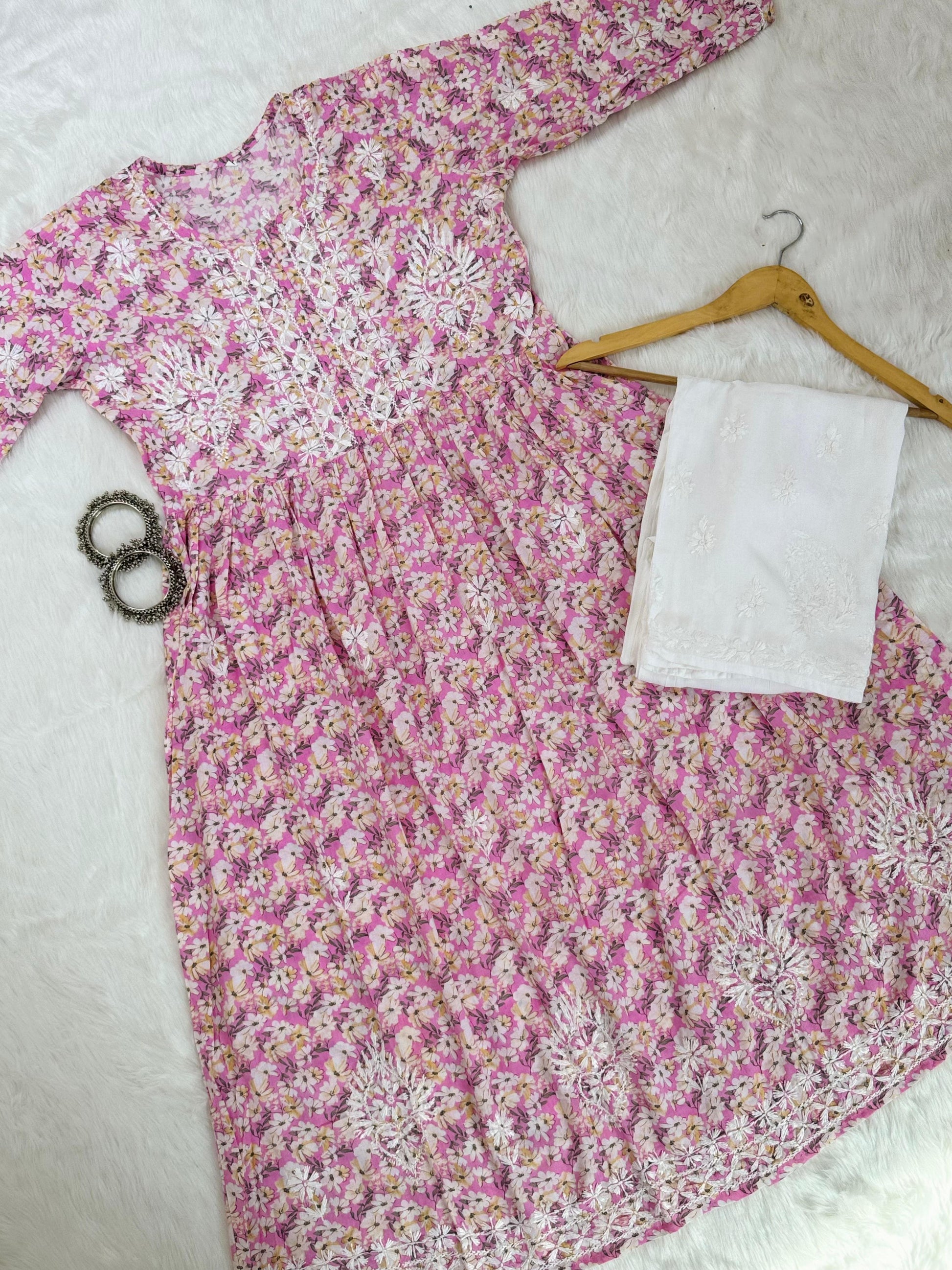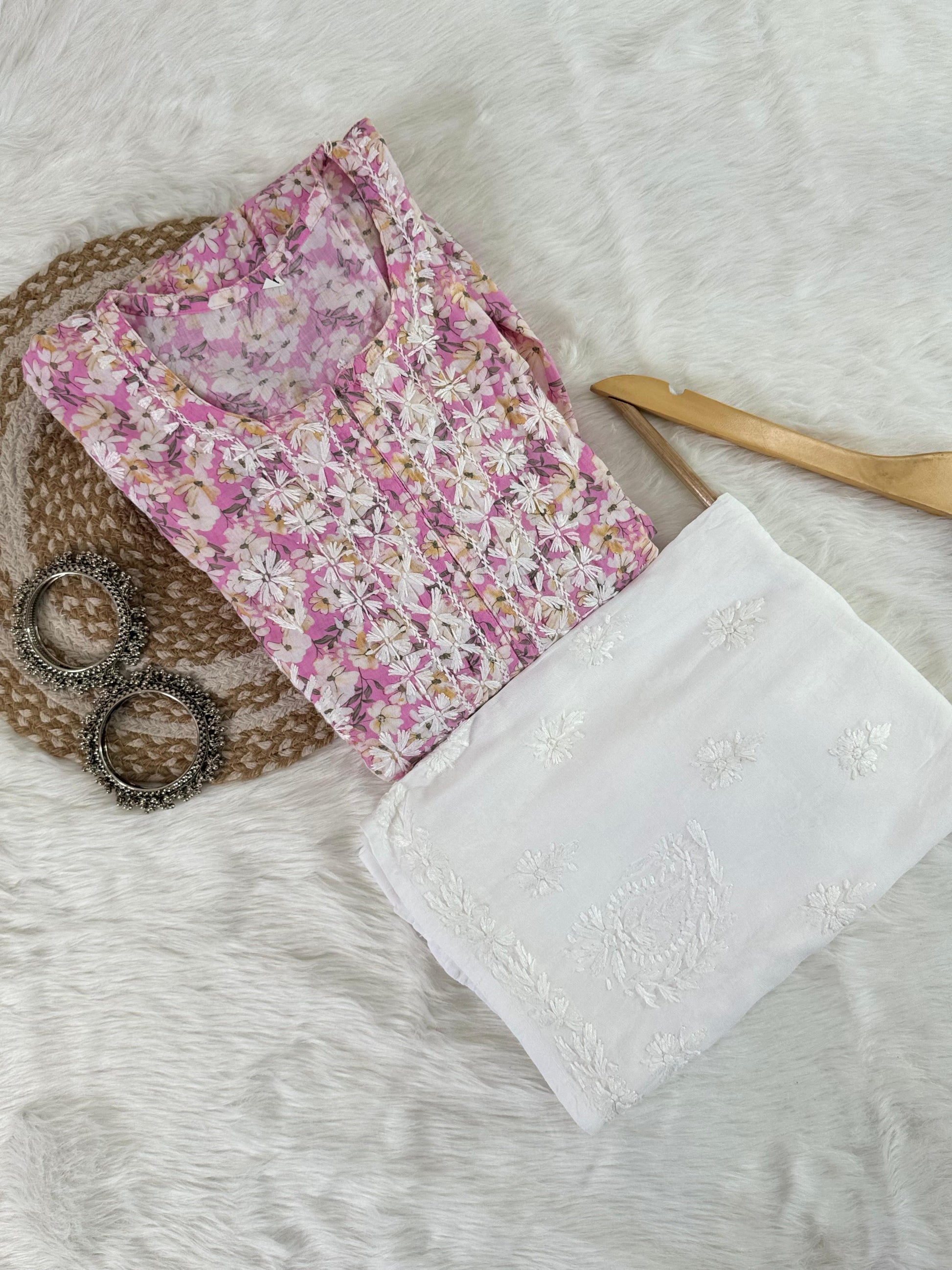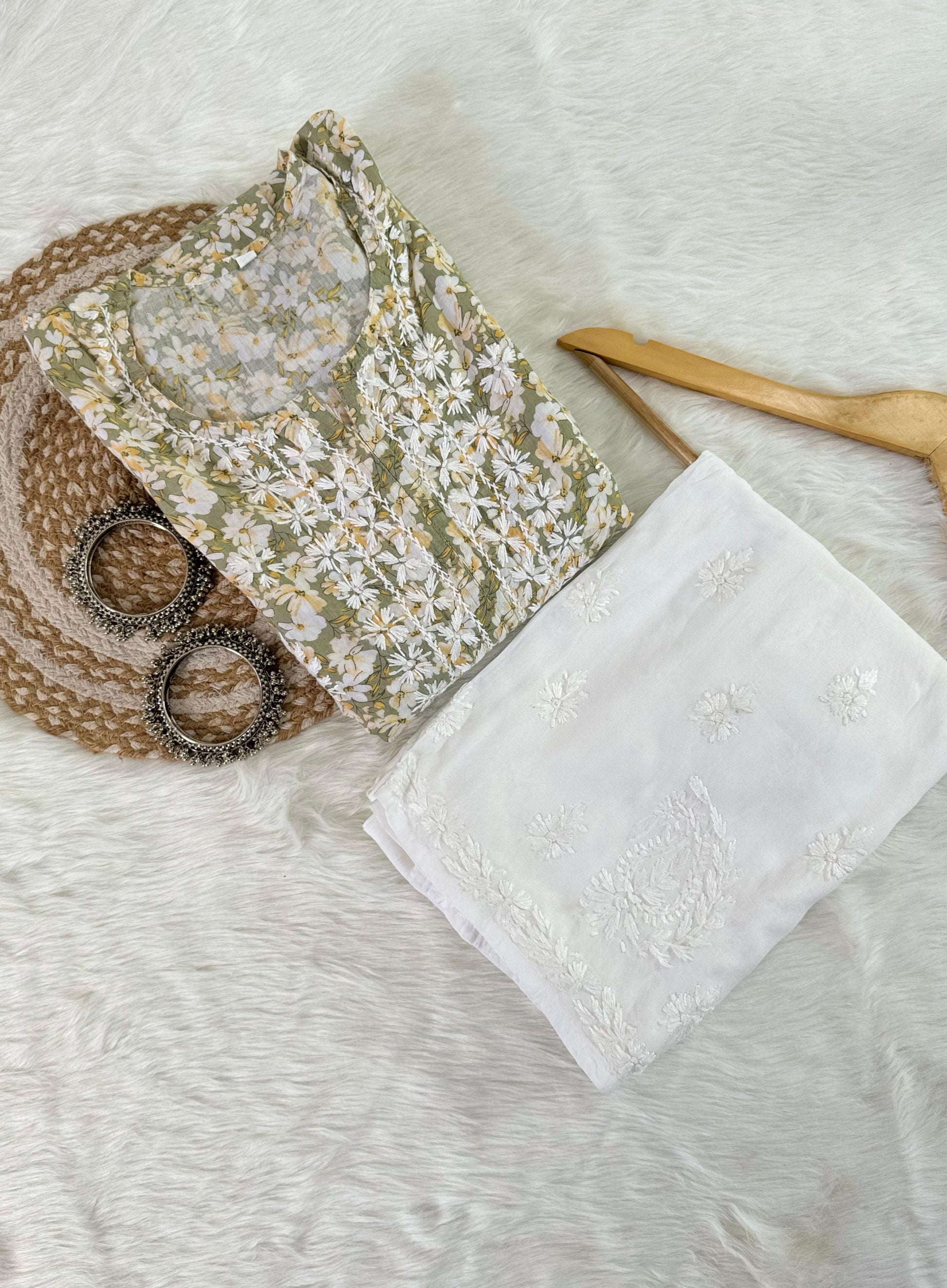 Summer Friendly Mul-Mul Floral Printed Chikankari Handwork Kurta & Stretchable Trouser